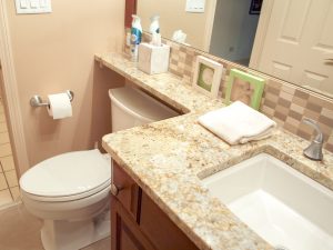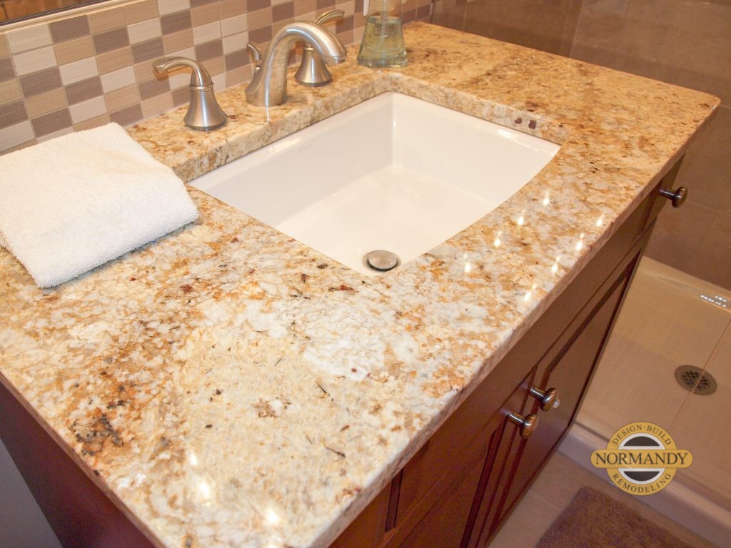 The next to go was the awkward, angled vanity. It was replaced with a cherry wood vanity. A dark stain with a glaze brings warmth to the space. The granite countertop also adds a nice blend of warm tones.
