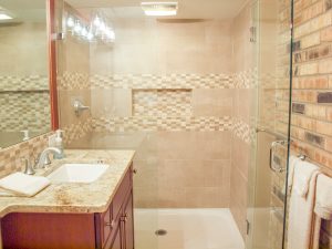 Inside the shower, a double band of accent tile adds balance and helps to bring interest. The lower band of accent tile continues along the wall to act as a backsplash for the vanity, which really helps to tie the room together. A simple, but slightly textured porcelain tile was used to the shower walls and floor, which helps the accent tile and existing brick wall stand out even more.