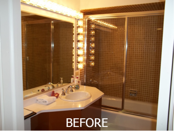 Walking into this bathroom was like traveling back in time to the 1970’s. There was patterned amber floor tile, an angled vanity and Hollywood-style lighting. The shower also had an amber mosaic tile on the walls and ceiling, making it feel dark and cramped. Ready to get with the times, the homeowners sought out the help of Normandy Designer Ashley Noethe.