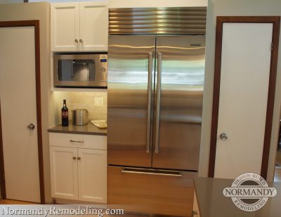 New appliances were critical to the success of this remodel. Placing a smaller, 30” range and chimney style hood provided a sufficient amount of burners and ventilation. A convection microwave oven also gave the option of a second oven, without taking up too much space. A built-in Subzero refrigerator also gave enough storage while maximizing the walkway clearance.
