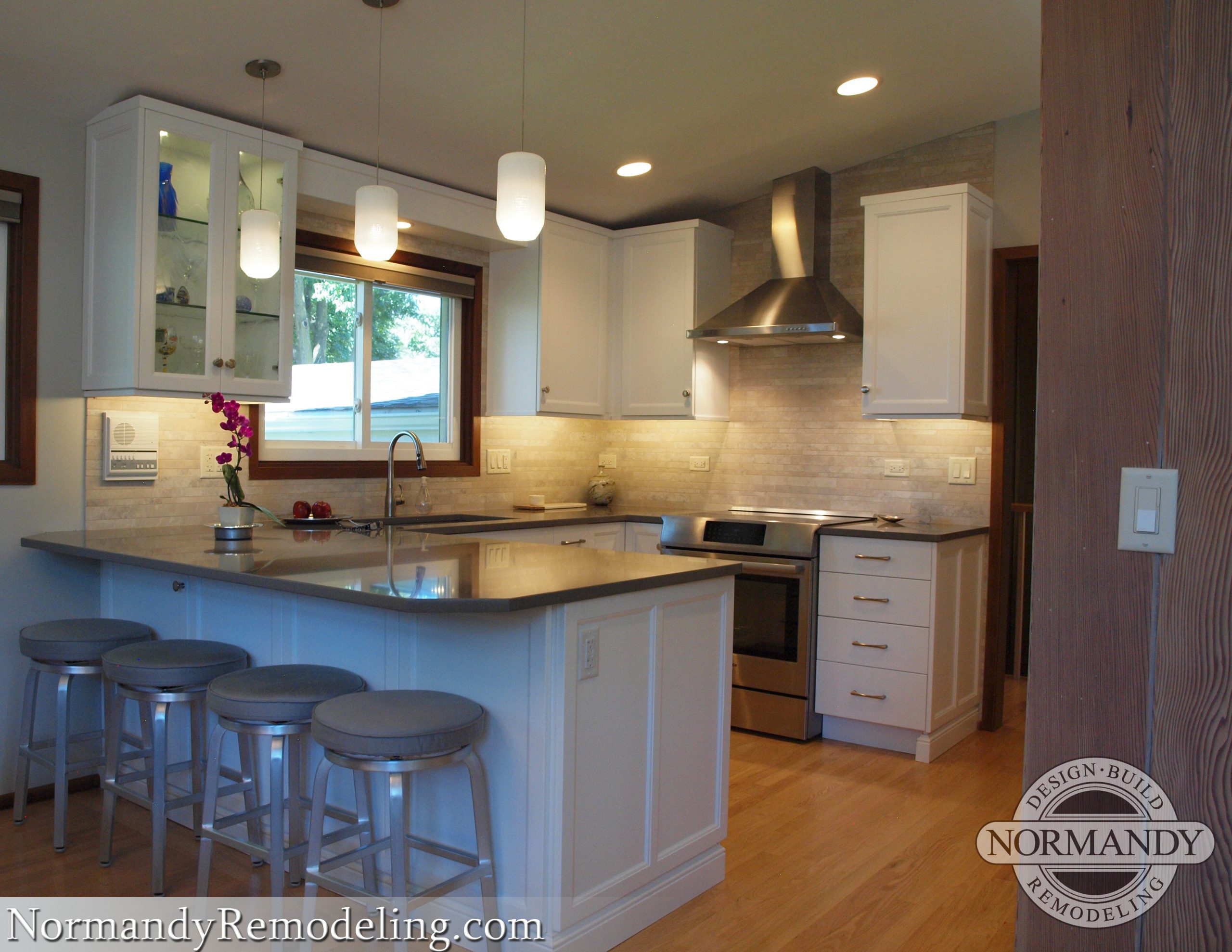 Last but not least, the outdated faux beams and soffits that housed fluorescent tube lights were replaced with recessed LED can lights. The wall cabinets have LED under-cabinet lights that provide great task lighting. The pendant lights over the peninsula were chosen for their beauty and simplicity and add another layer of lighting to the space.