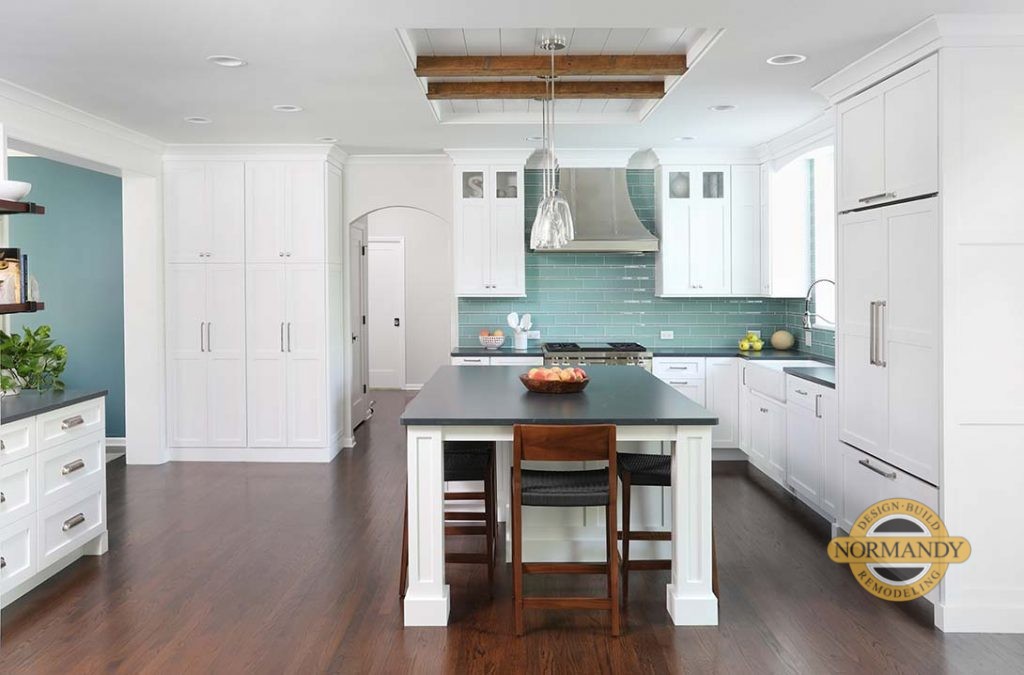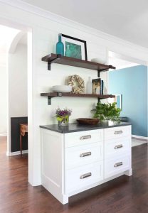 While we were able to create a new open floor plan, we made sure we didn’t sacrifice storage. We reconfigured the kitchen layout to ensure there was a place for everything. A small desk area that wasn’t used was replaced with cabinets and open shelving. We also installed a large pantry for storing groceries and glass cabinets for displaying favorite dishes. It’s a beautiful and organized space that will work well for their family’s lifestyle.