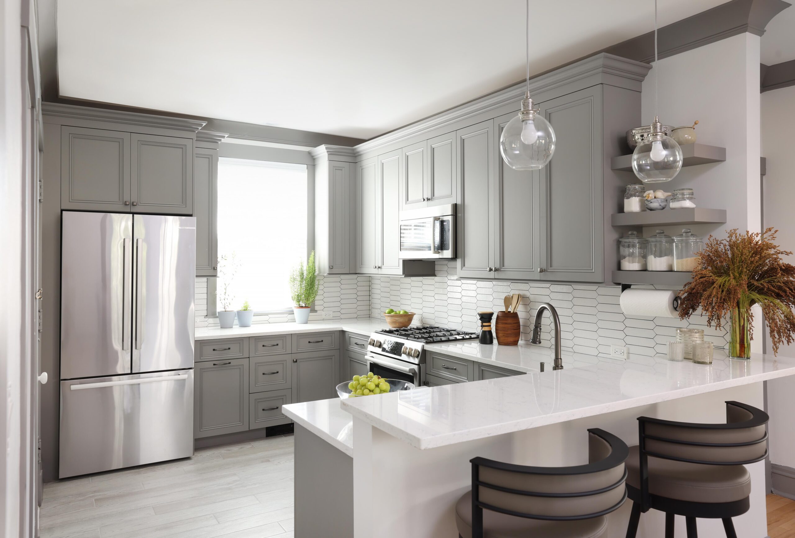 “In this home, we took down the wall between the kitchen and dining room, which increased the footprint of the kitchen slightly and allowed for a clear sight line to adjacent rooms,” says Ashley. “We also provided extra storage and seating by extending the kitchen peninsula into the dining room without compromising their dining space.”
