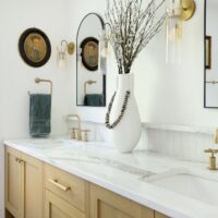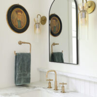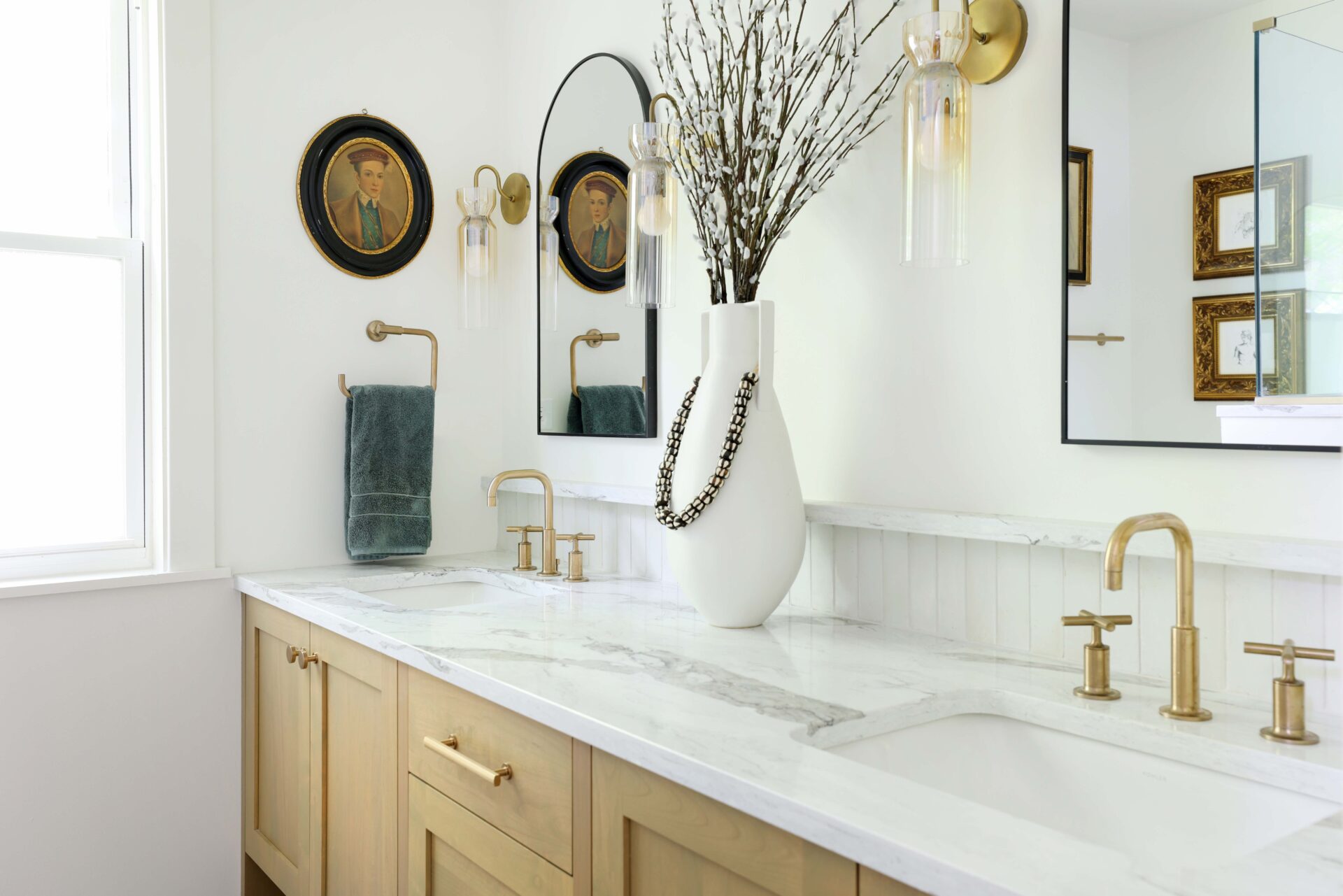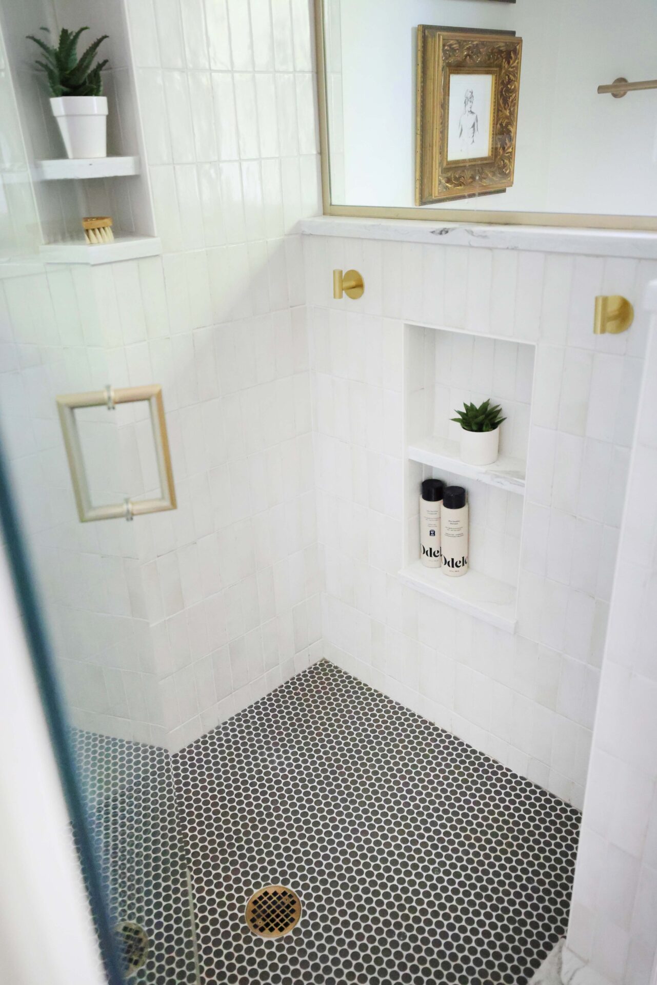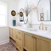 With a focus on openness, this bathroom exudes eclectic style. The vanity’s furniture-like design creates adds to the vintage aesthetic, while a quartz ledge and recessed medicine cabinets provide more storage. The arched shower niche and brick-like flooring complete the modern bohemian aesthetic.
