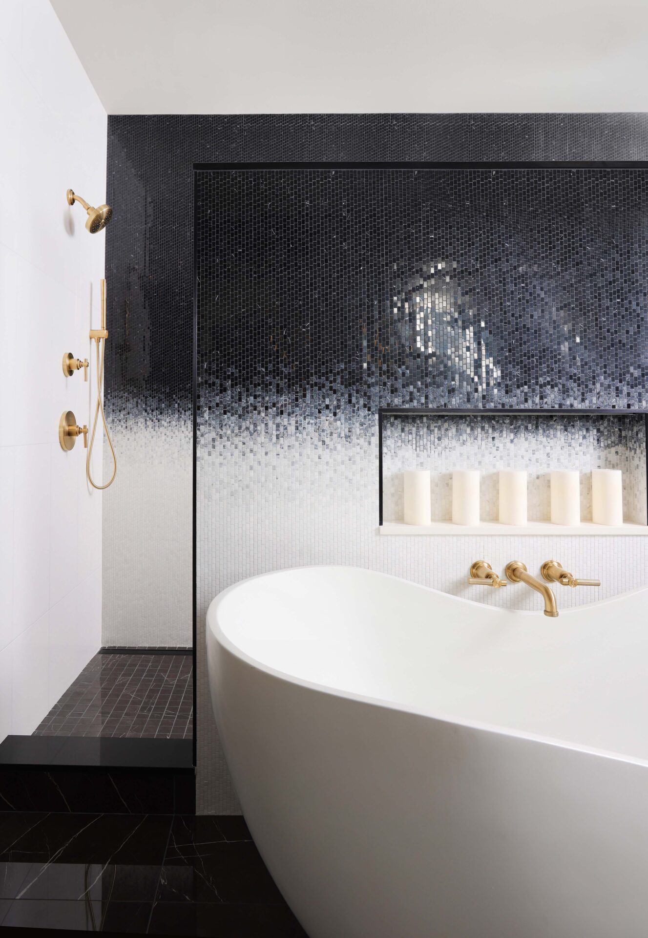 For another bathroom, Becca designed a double-sided niche, one serving the freestanding bathtub and another on the opposite side for the shower. “You just have to be mindful about staggering their heights,” she explains. “Because they share a wall, you can’t place them in the same spot, but you can make them visually connect.”
