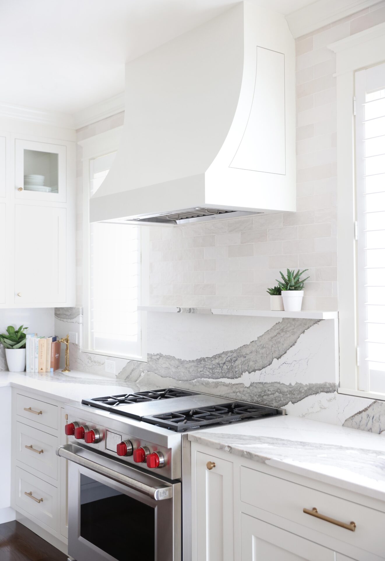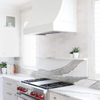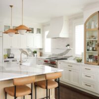 Modern living meets vintage charm in this updated kitchen remodel. A charming arched hutch, warm wood cabinetry, farmhouse sink, bold countertop and backsplash veining, and eclectic finishes add modern bohemian style to the spacious new floor plan.