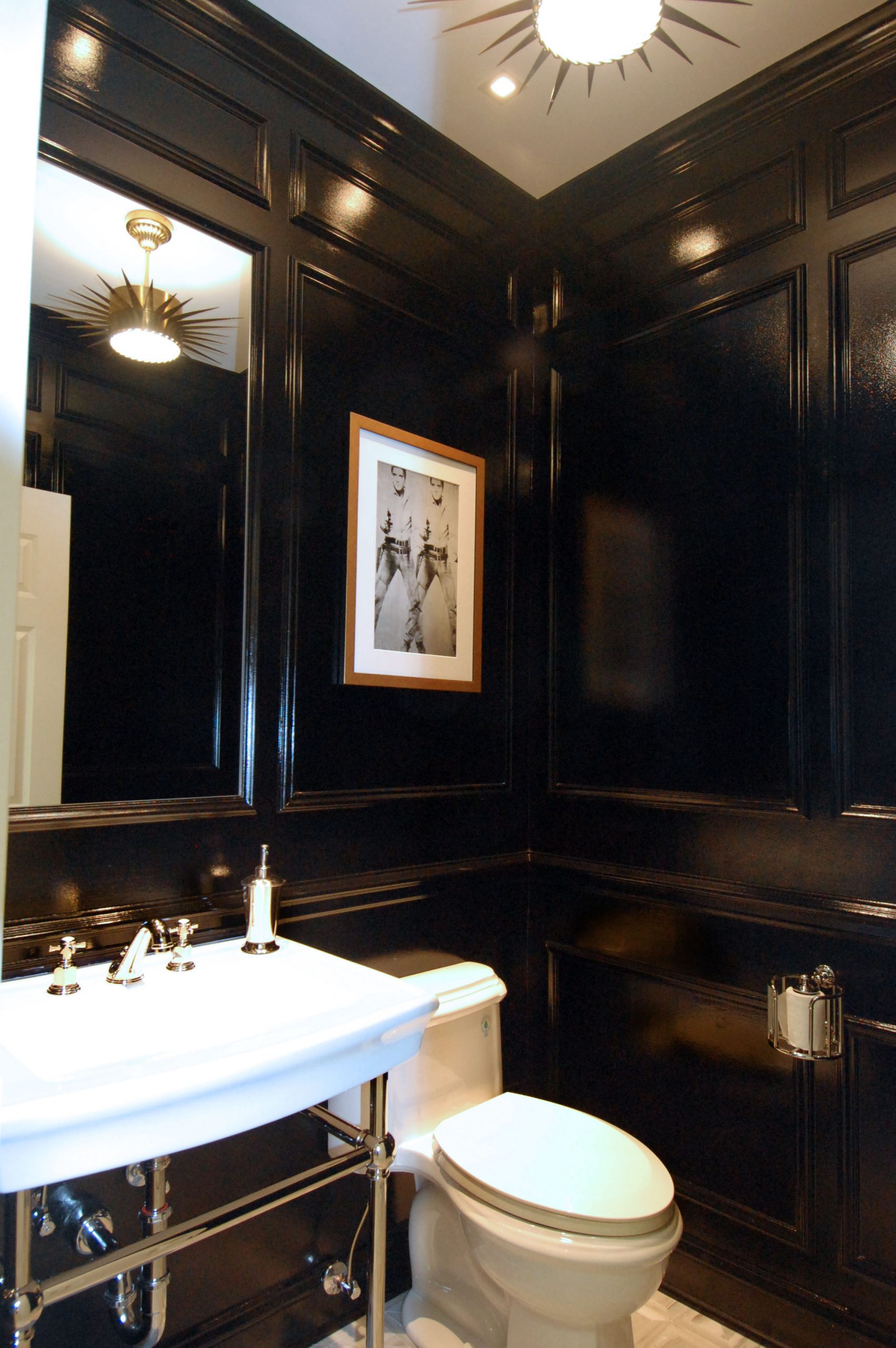 Think of the powder room as a jewel box. This is a place where bold wall colors like high-gloss navy or black can really shine or provide a dramatic background for a dazzling light fixture.