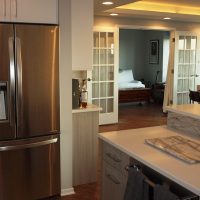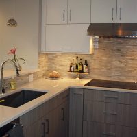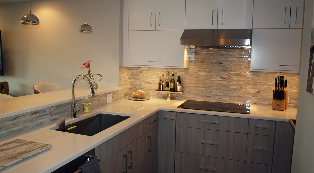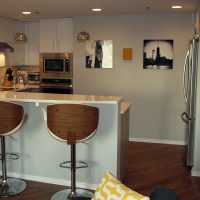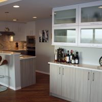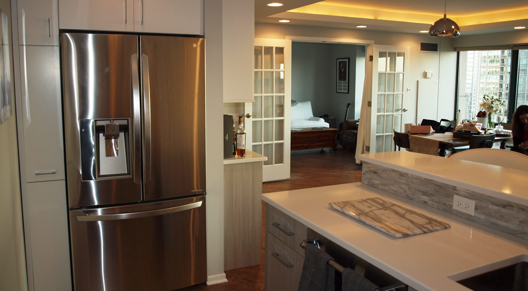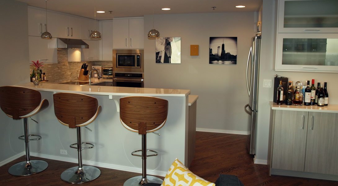 This small Chicago condo kitchen is big on style. Painted white cabinets are paired with gray textural laminate cabinets to create a modern, yet casual space. The adjoining cabinetry serves as a butler’s pantry or as a bar for entertaining. Uplighting in the tray ceiling of the adjoining living area creates soft light that contributes to the ambiance of the condo.
