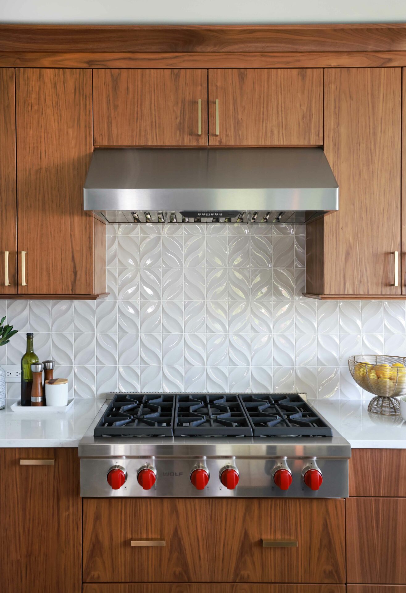 When arranged together these textured tiles can create their own geometric patterns, regardless of the shape of the actual tile. “In a crisp, white kitchen where the slab island countertop was the star, we chose a white square wall tile that had a raised texture. This added another shape,” says Abby. Arranging these textured tiles in the right composition created subdued diamond effect on the backsplash.