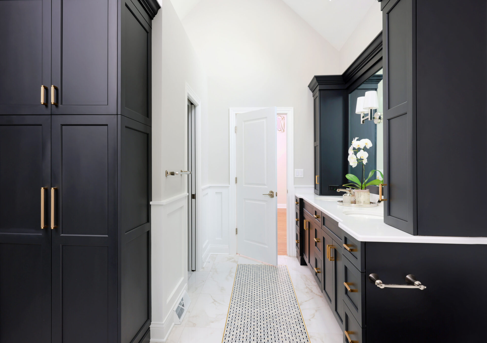 Inspired by an intricate tile pattern, the bathroom shakes up the classic combination of black and white with a dramatic black vanity that’s supported by white and light shades throughout the rest of the room. Mixed metals bring in some sparkle, including as a trim on the tile rug in the center of the room. This is a bathroom that can make getting ready every day feel like a special occasion.