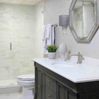This luxurious bathroom was part of a basement remodel. This full bath has a walk in shower, large vanity for storage and plenty of light and beautiful fixtures.