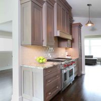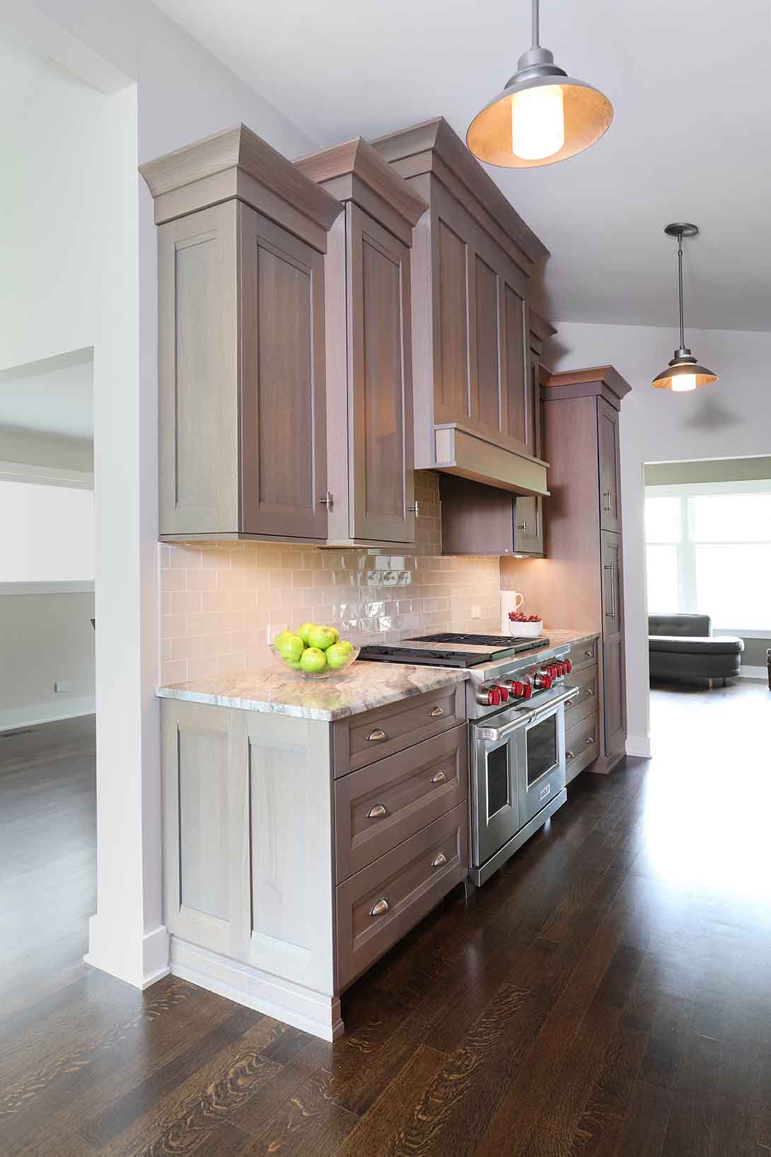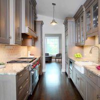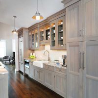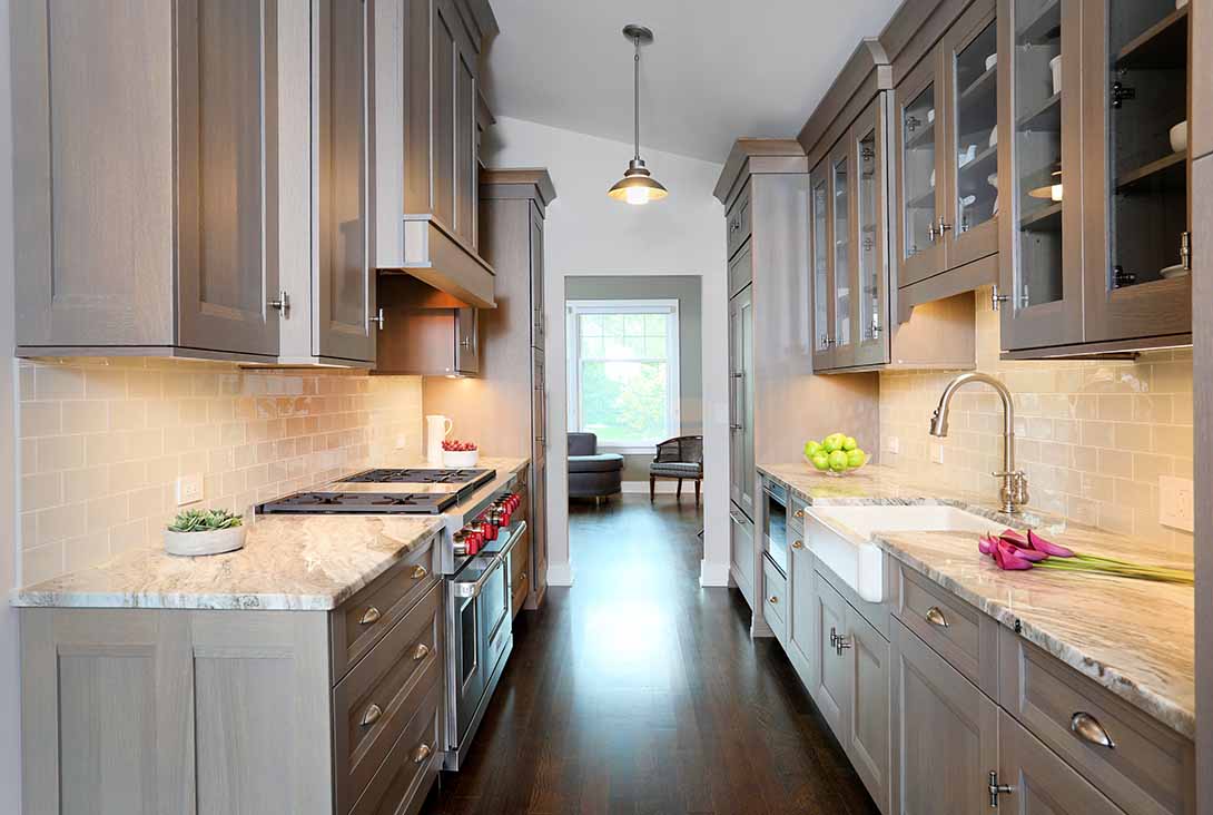 This galley style kitchen was part of a larger overhaul of this entire home, that included the basement and several bathrooms. This kitchen features beautiful grey washed cabinetry, quartz countertops, an apron front sink and professional grade appliances.