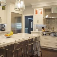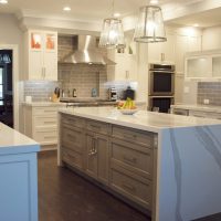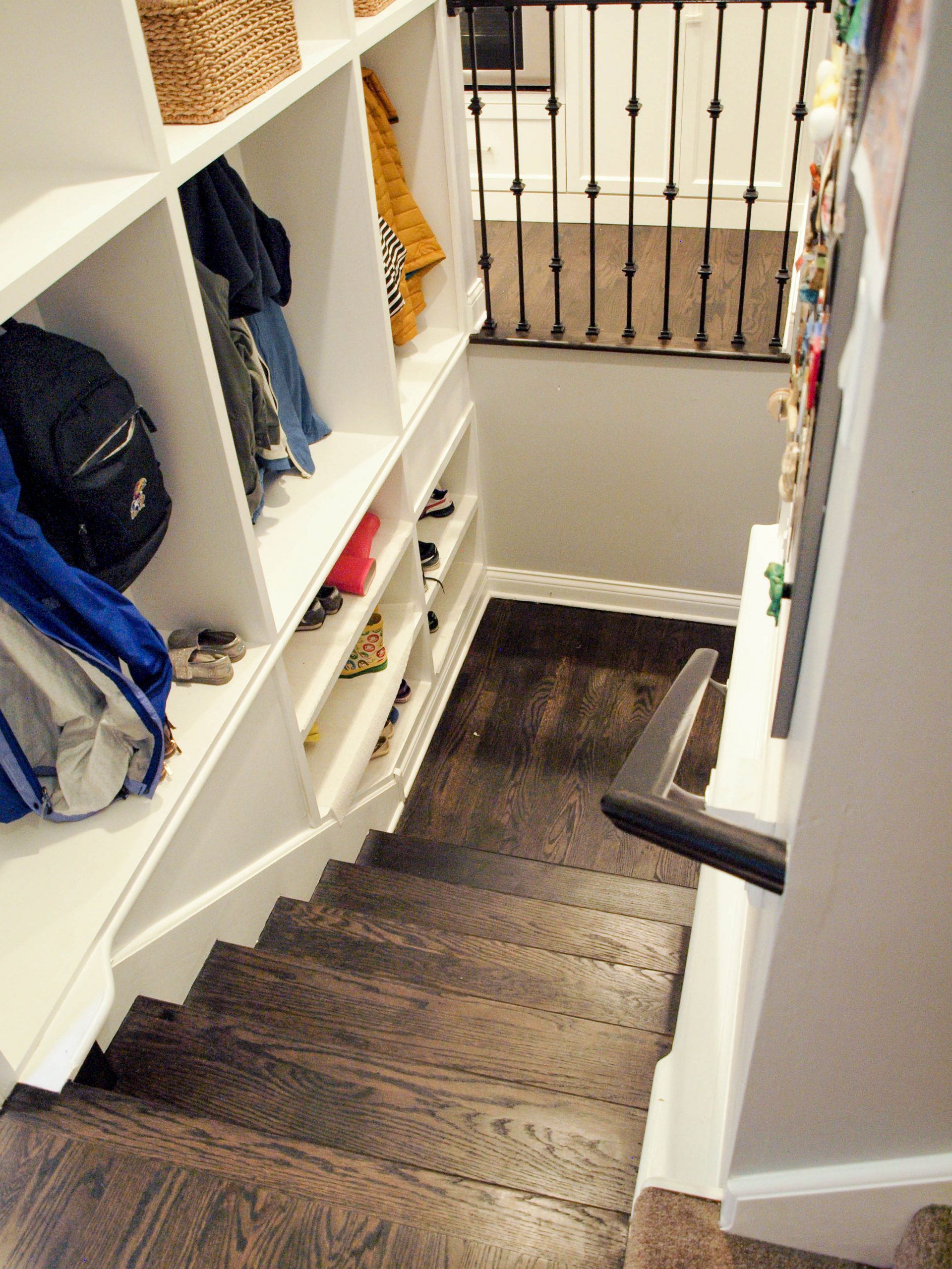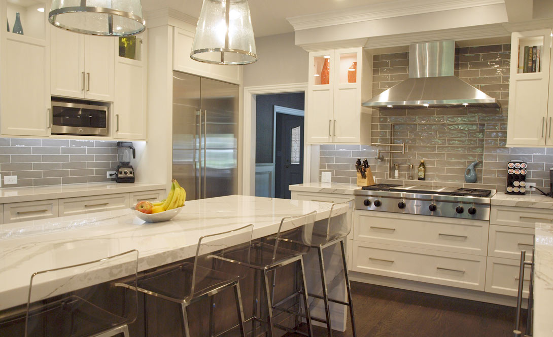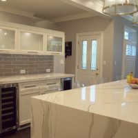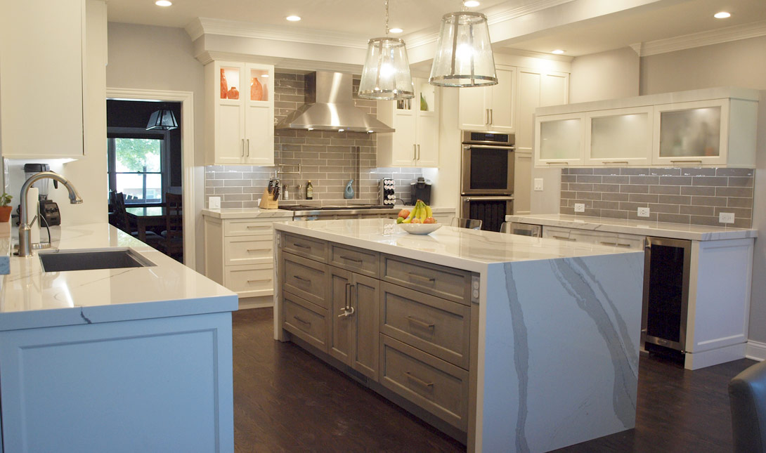 A few adjustments to the floorplan of this transitional style kitchen have paid many dividends. In addition to the updated style that includes white and gray cabinets, a waterfall countertop, and subway tile, this newly enhanced layout makes the kitchen more functional and conceals a series of mudroom cubbies for the family. Widening the stairs to the basement created enough room for hooks and shelving to keep this busy family organized and clutter-free.
