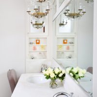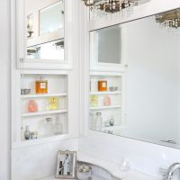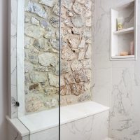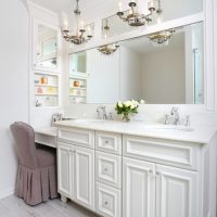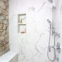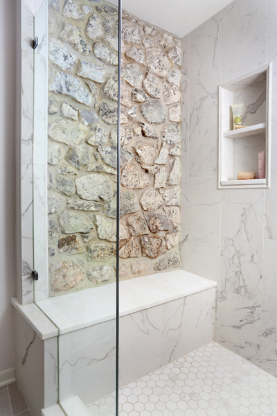 Understated glamour defines this bathroom, which features striking chandeliers, divided mirrors and a dedicated makeup table. The back wall of the shower retains a rustic element of the prior bathroom that was a favorite of the homeowners, and offers a textural contrast from the marble-look wall tiles.