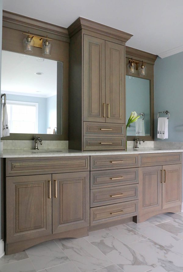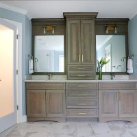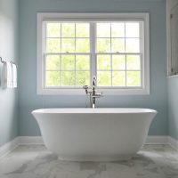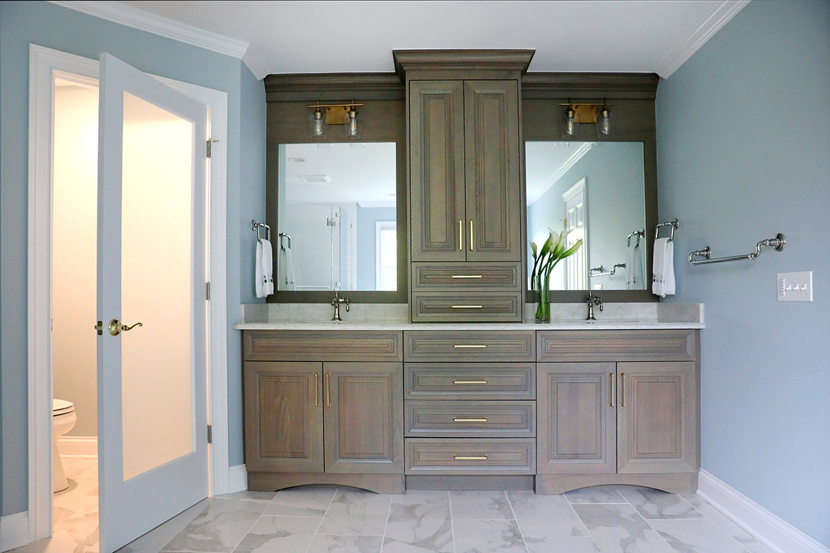 CLOSE MENU This relaxing retreat has beautiful form and function with clean modern lines and a cool pallet. A large soaking tub fits perfectly under the windows giving you a view of the blue sky and the spa-like shower is sure to please with a seated bench and glass doors. Double side by side vanities is nice for sharing your bathroom and an enclosed toilet room will give you all the privacy you need.