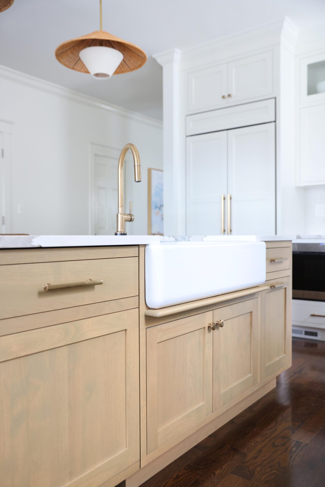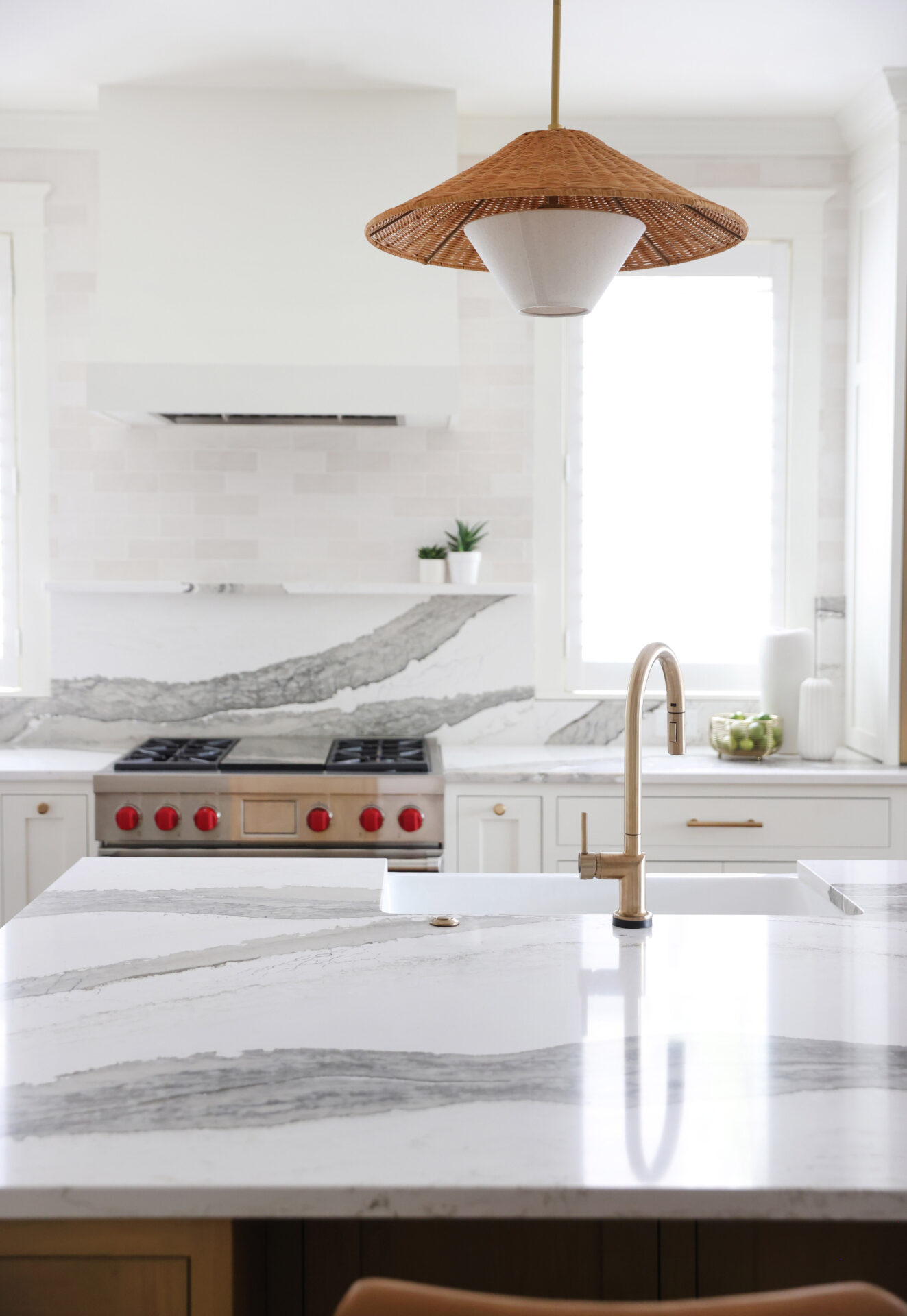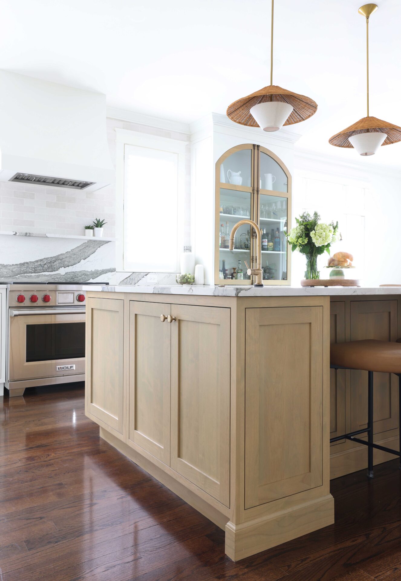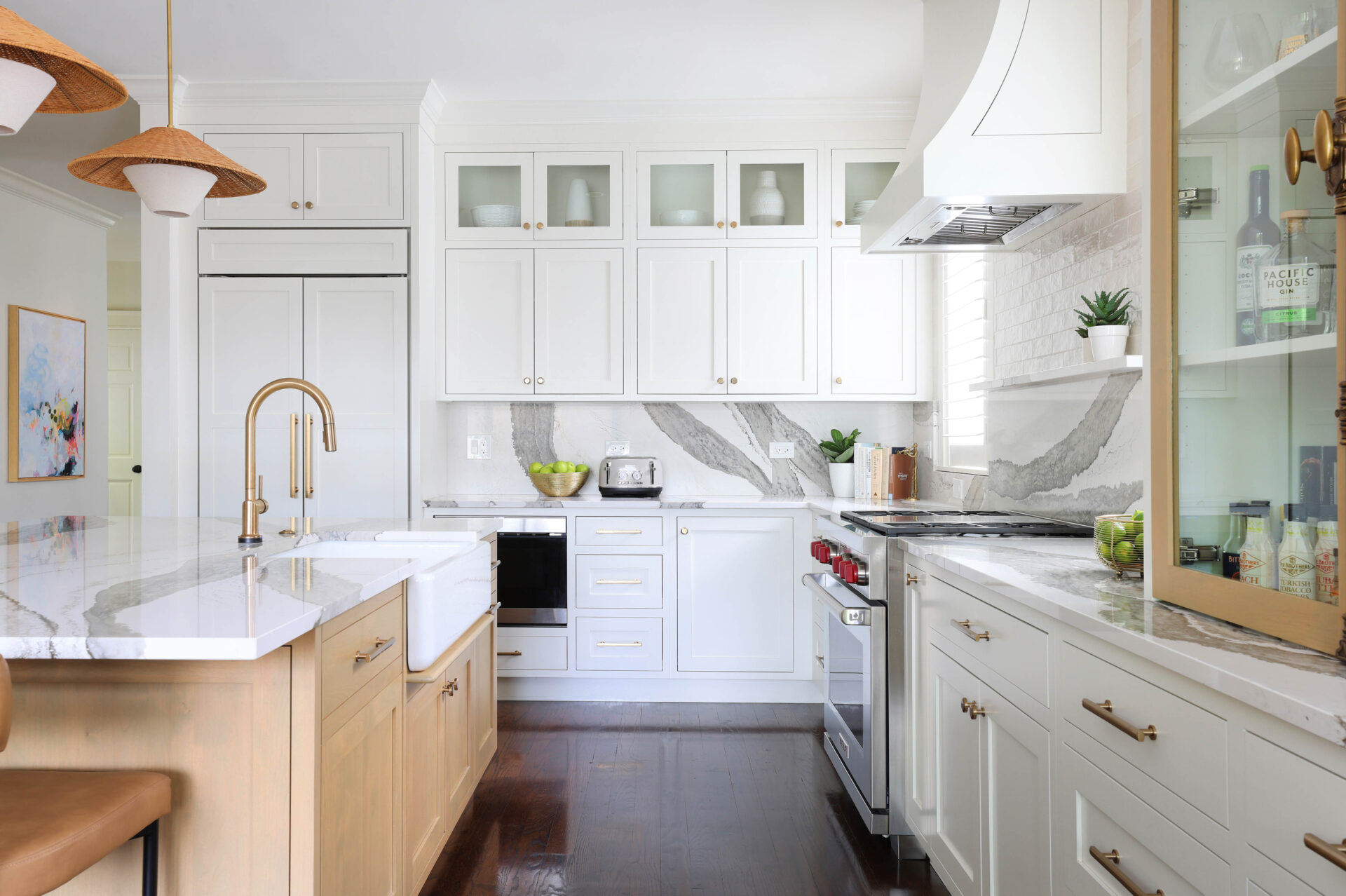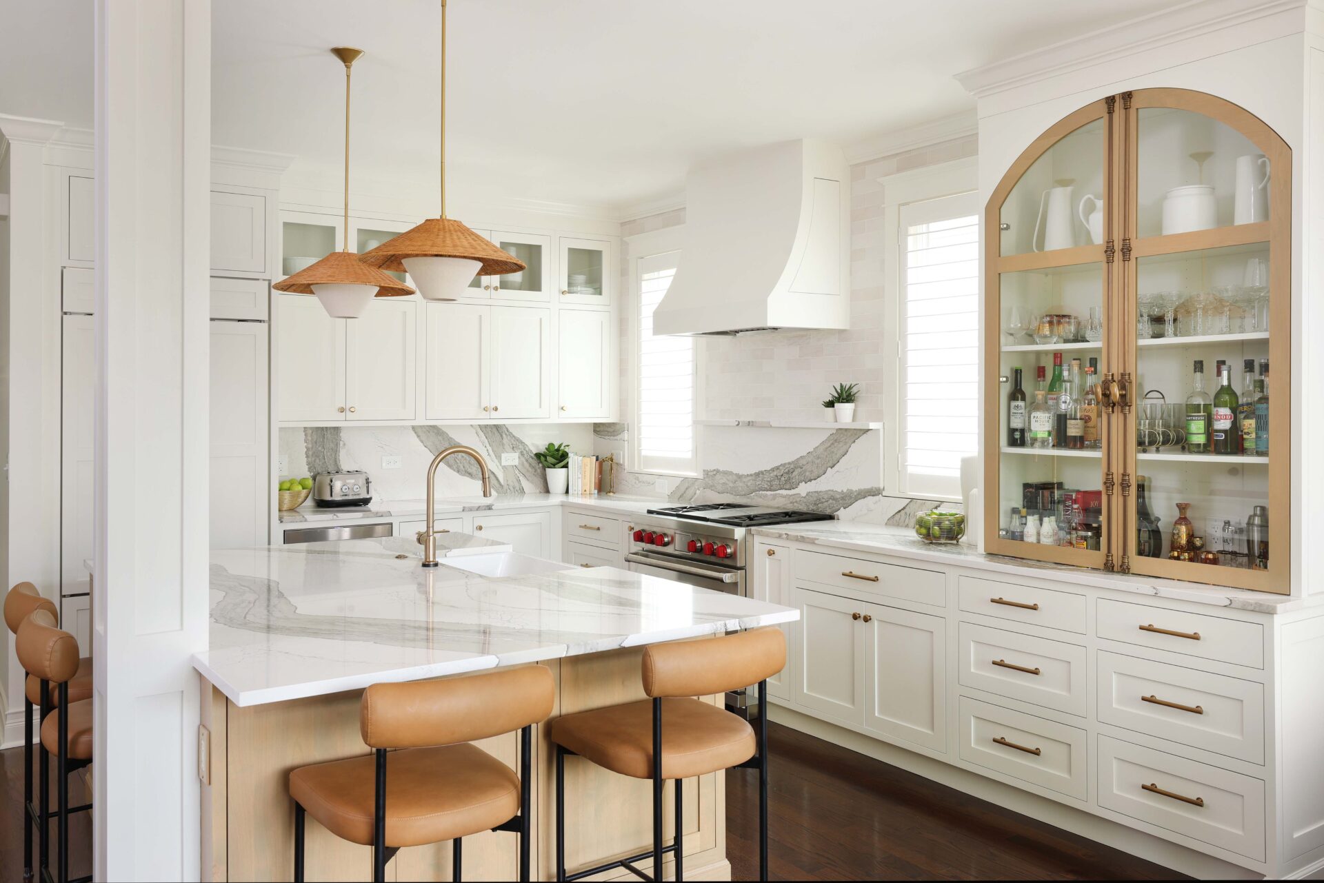 Finishes throughout the kitchen brighten the space and are both visually interesting and functional. The backsplash and countertops feature bold-veined quartz countertops that give subtle movement, while making a statement. Texture was introduced into the design through decorative pendant light fixtures above the island, and leathered stools, reinforcing the modern bohemian aesthetic. “The farmhouse sink, accented with a drip-edge detail, adds a subtle nod to craftsmanship, paired with a gold faucet, white basin, and the warmth of surrounding wood cabinetry,” Jackie explains. “It creates a balanced blend of function and style.”