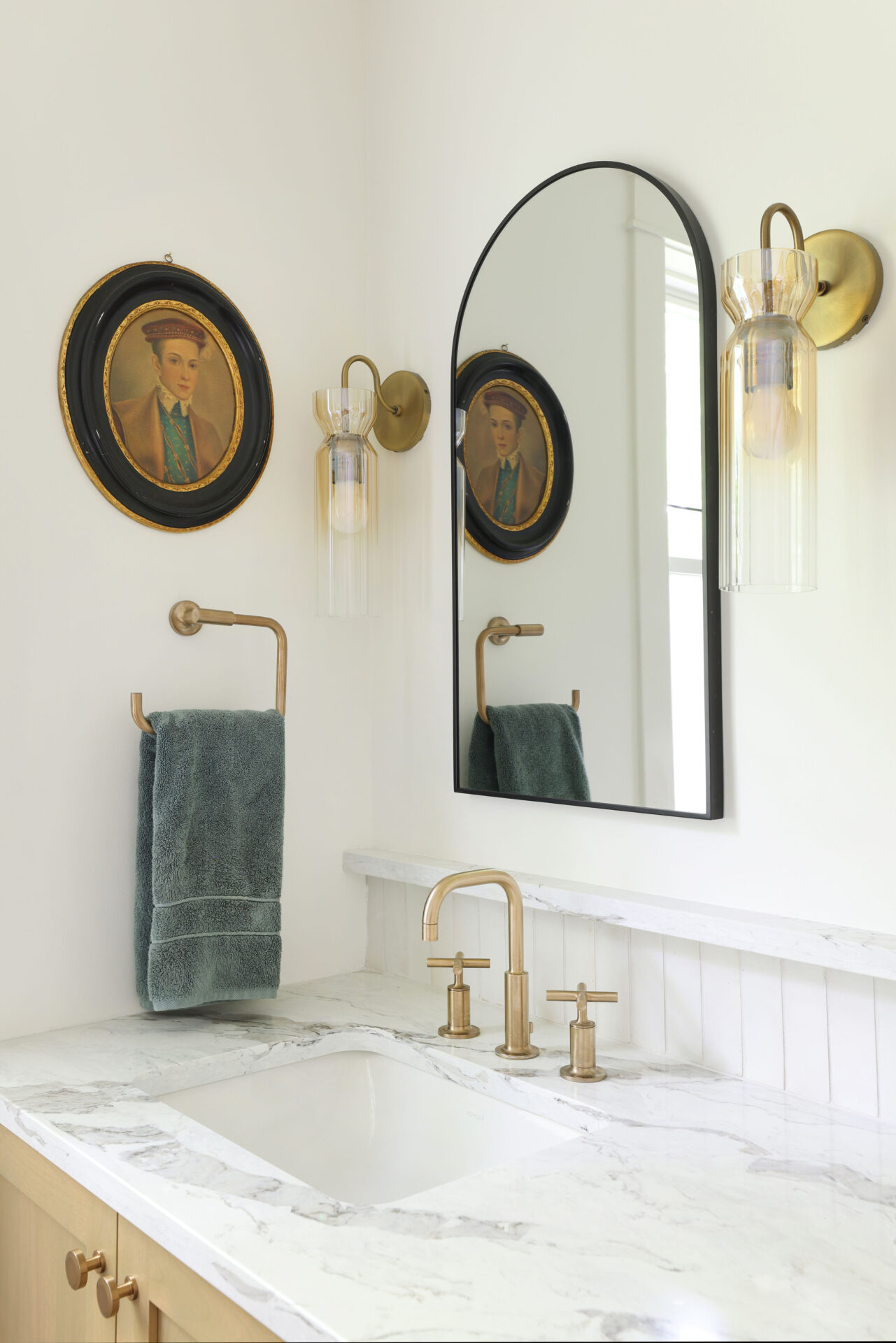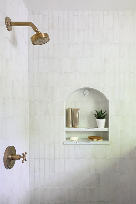 The bathroom posed different constraints, primarily size. “The goal was to make it feel bright and open without sacrificing storage,” Jackie says. “We designed a custom vanity that looks like a furniture piece giving it a lighter, freestanding look and also added recessed medicine cabinets for storage.” A highlight in the space is an arched shower niche, echoing the kitchen’s arched display cabinet and creating continuity throughout the home. Underfoot, brick-inspired floor tiles bring rich texture and a hint of timeless charm.