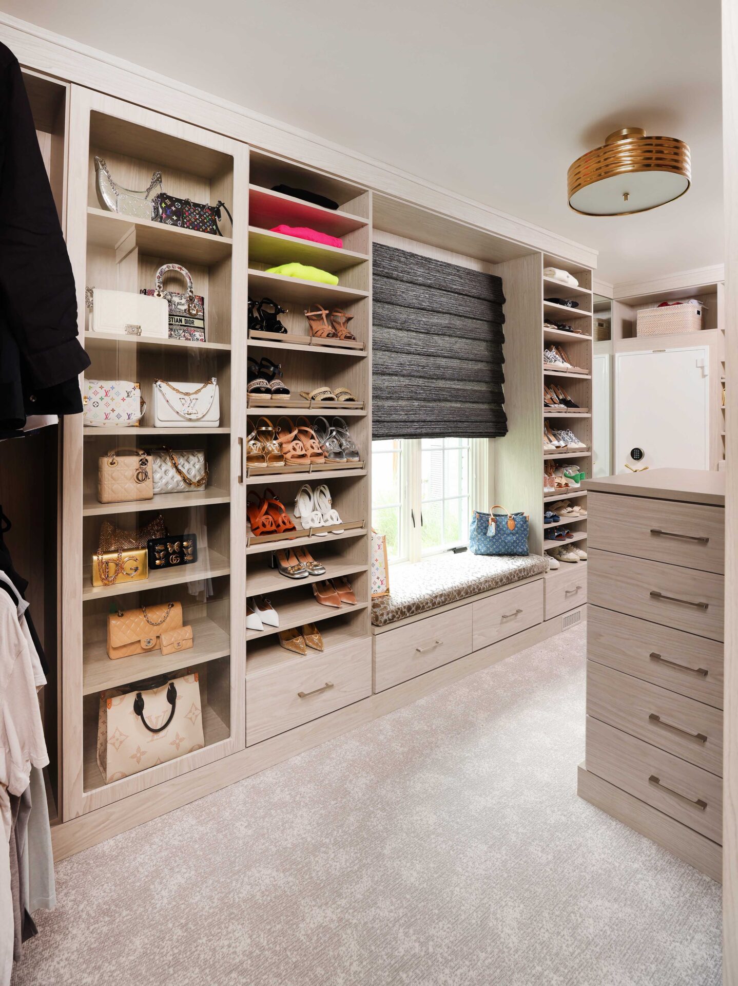 In this home built in 1979, the bedroom was considerably larger than the connecting bathroom, which had too large of a tub area and too small of a shower. “The floor plan was giving a lot of space to an underutilized, very large tub deck, but a larger shower would be a more functional use of the space for them,” says Normandy Designer Becca Ruggiero. “The closet was also too small, and they wanted better storage and organization throughout the entire suite as well.”