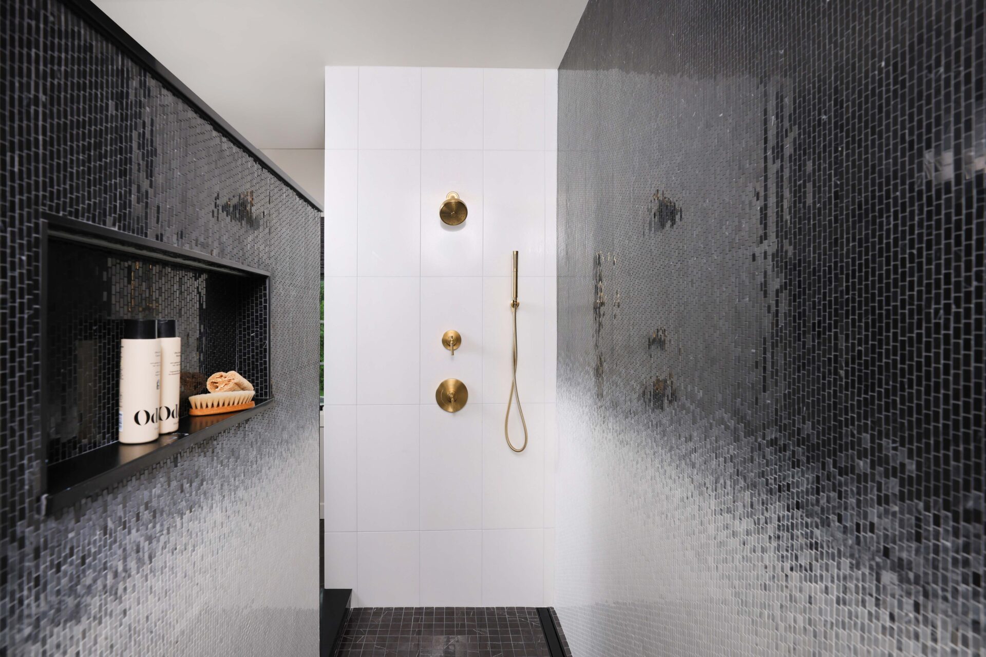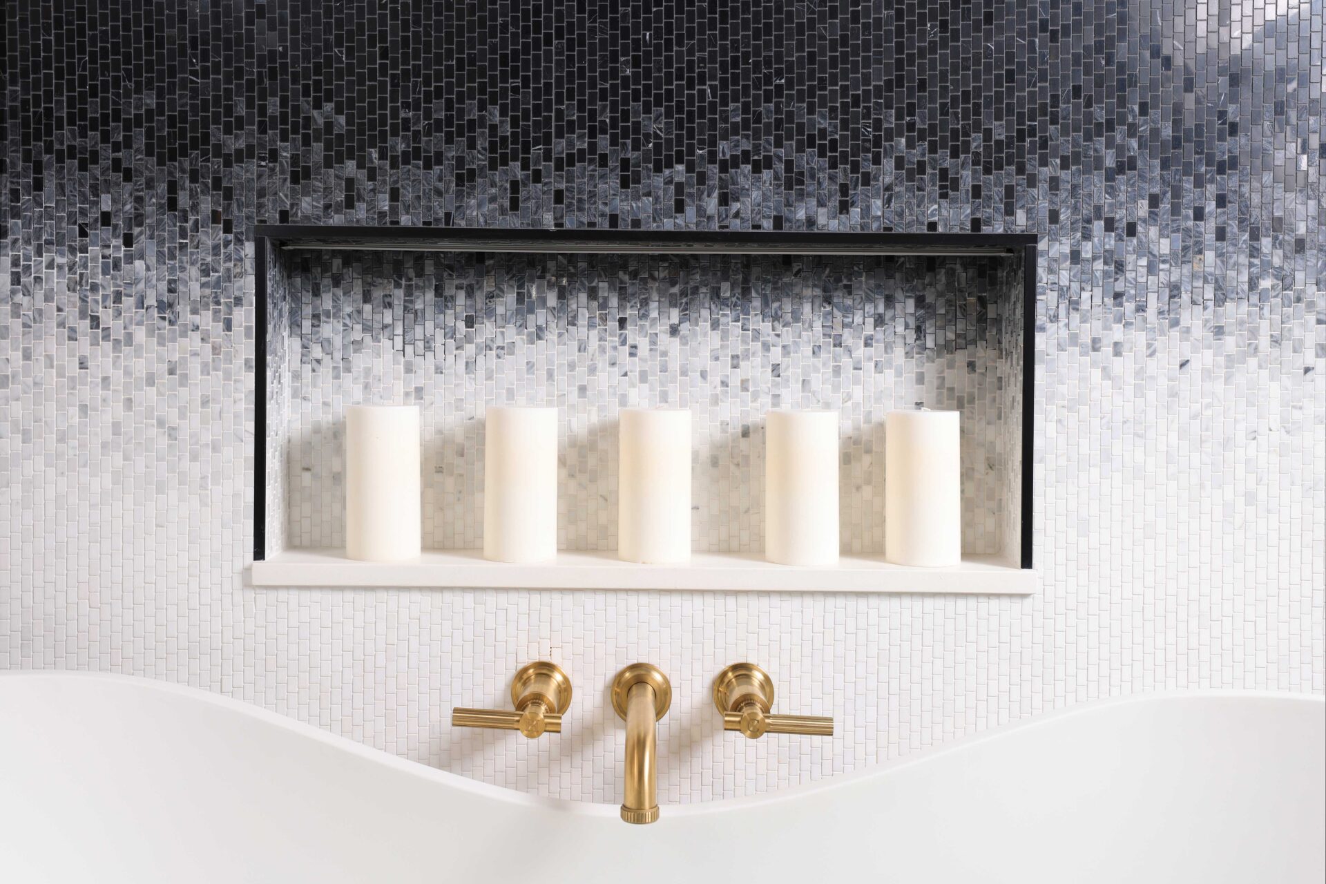 “They were drawn to high contrast elements, and you can see that in the dark graphite floor tiles and light marble countertops. It’s also evident in the wall tiles behind the bathtub and in the shower with their stunning ombre pattern.”