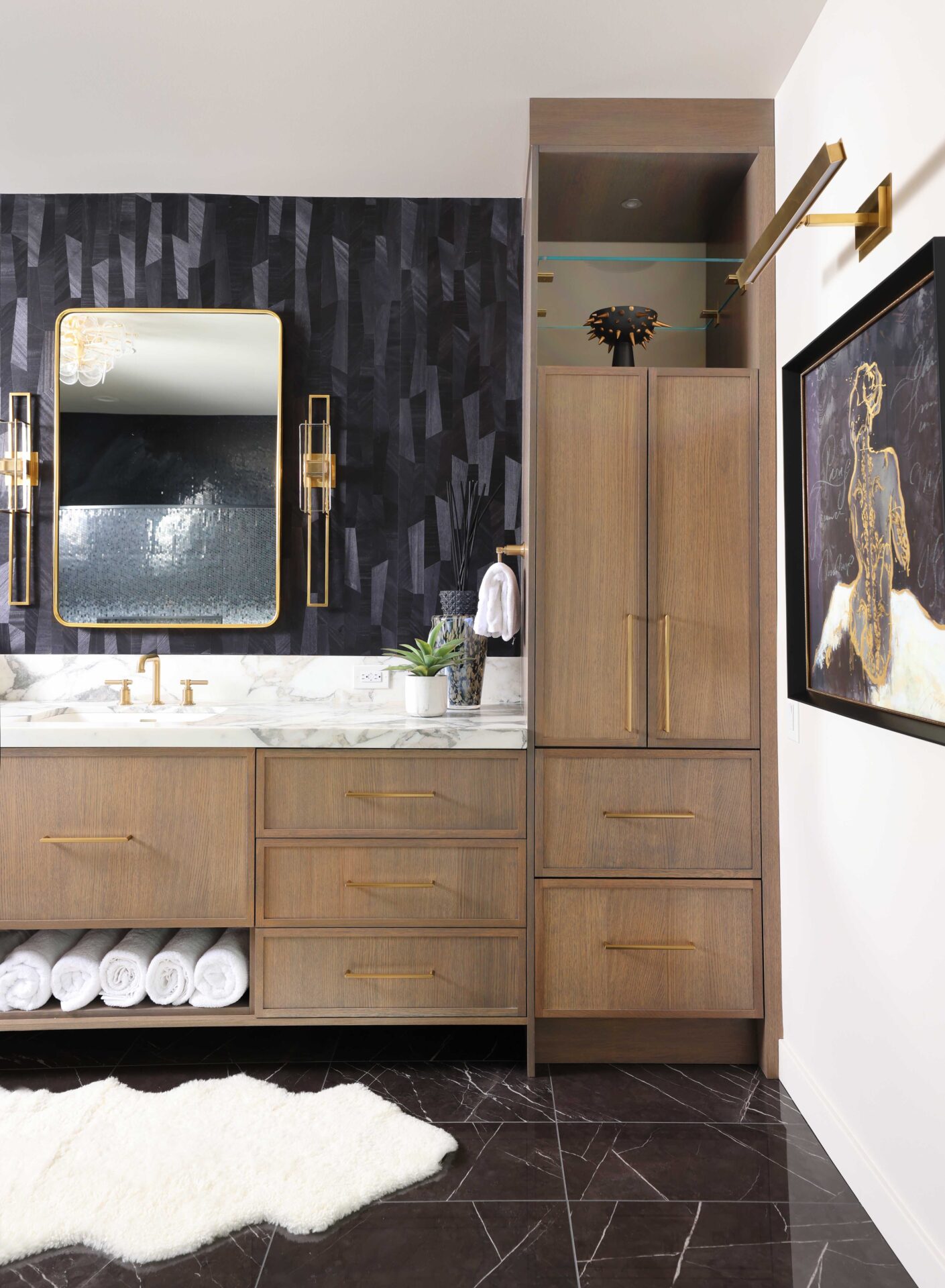 “We wanted to create a unique space that gave far greater impact to the vanity and shower space. And while the design still features a tub, it’s more of an elegant accent piece,” Becca says. “Focusing on contrast and function throughout the space created a new dramatic flow that works very well for this family.”