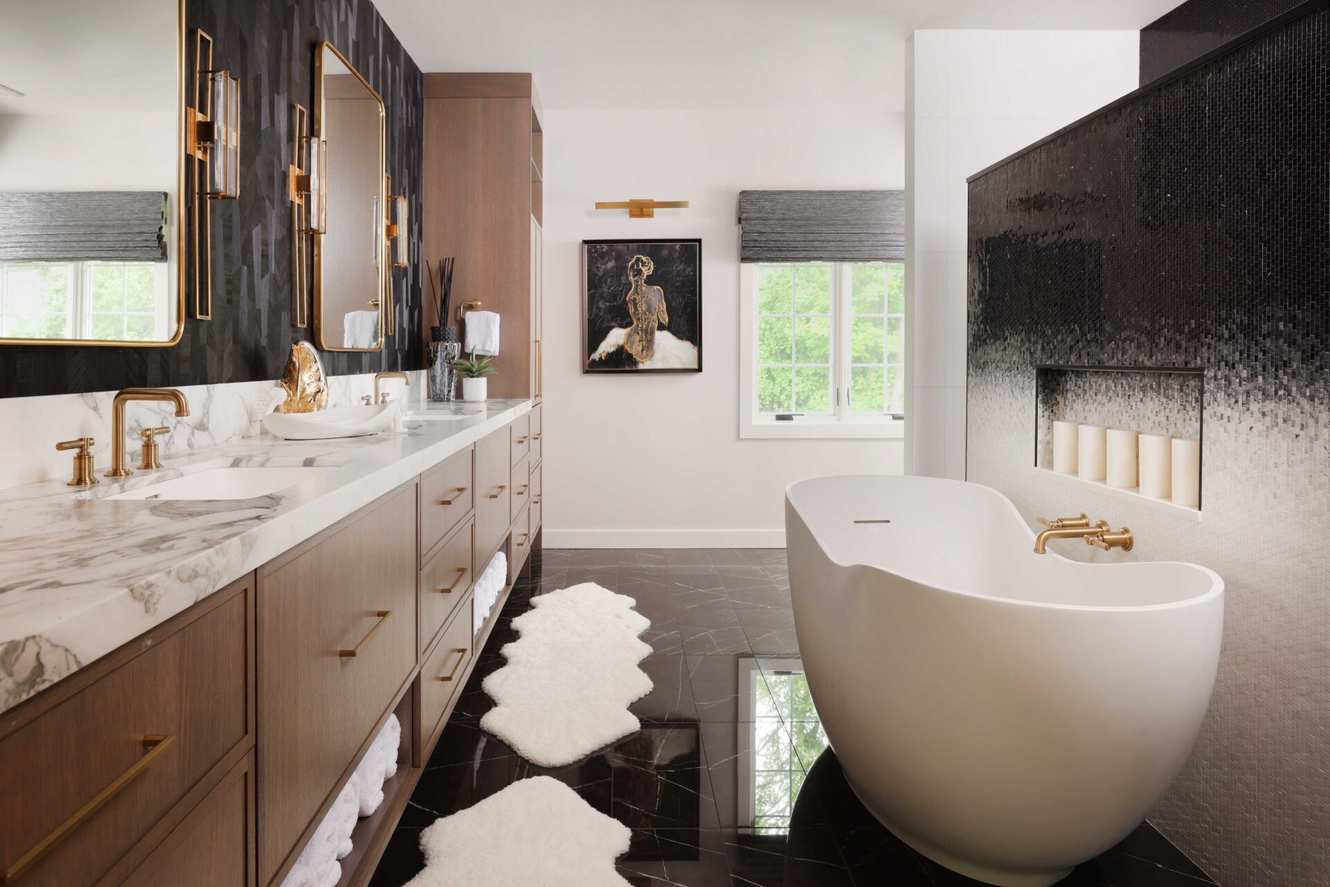 Modern Glam Bath Adds Drama to New Primary Suite Layout