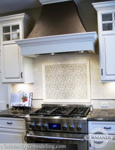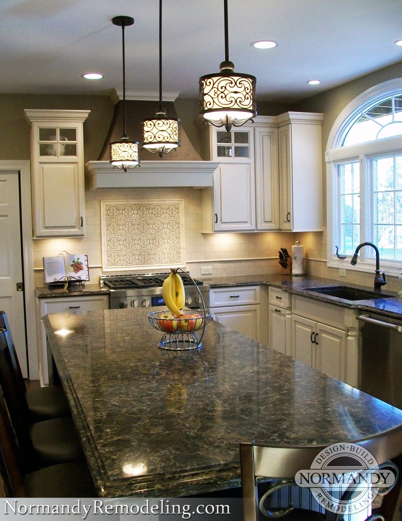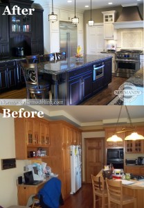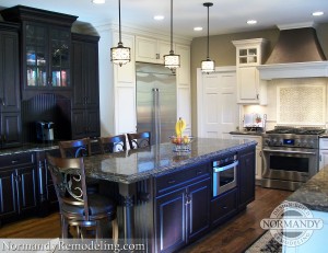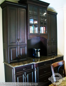 Leslie incorporated decorative touches and a combination of white painted kitchen cabinets, dark stained cabinets and glass door cabinets to break up the design elements and lighten the visual weight of the built in cabinetry. In the end, Leslie was able to give these homeowners the kitchen they had been waiting for.
