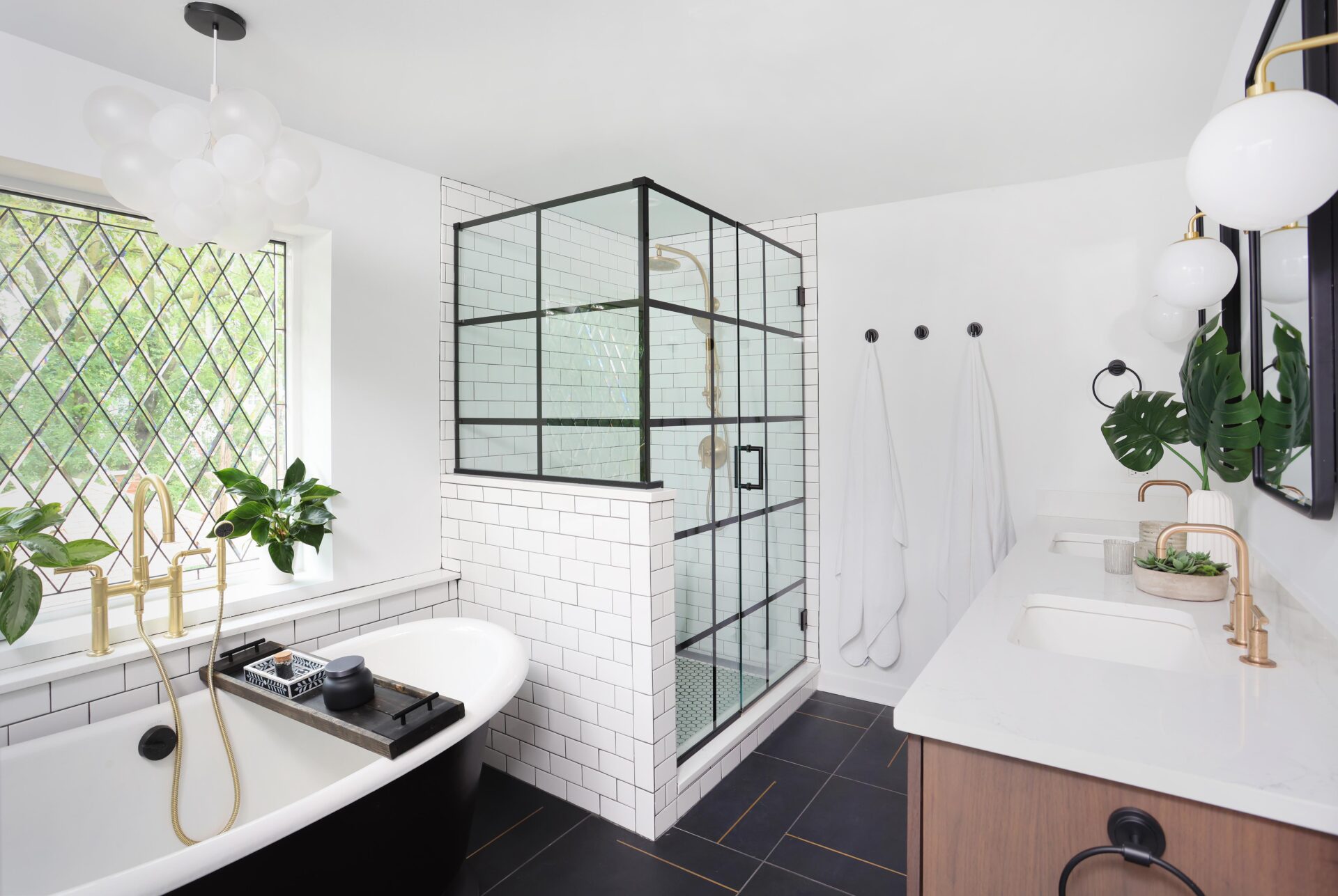 Plumbing and electricity were added, as well at stunning diamond-shaped leaded glass windows. This primary bathroom enjoys a spacious layout, complete with a gridded shower and freestanding tub, that has touches of farmhouse while a modern aesthetic at the same time.