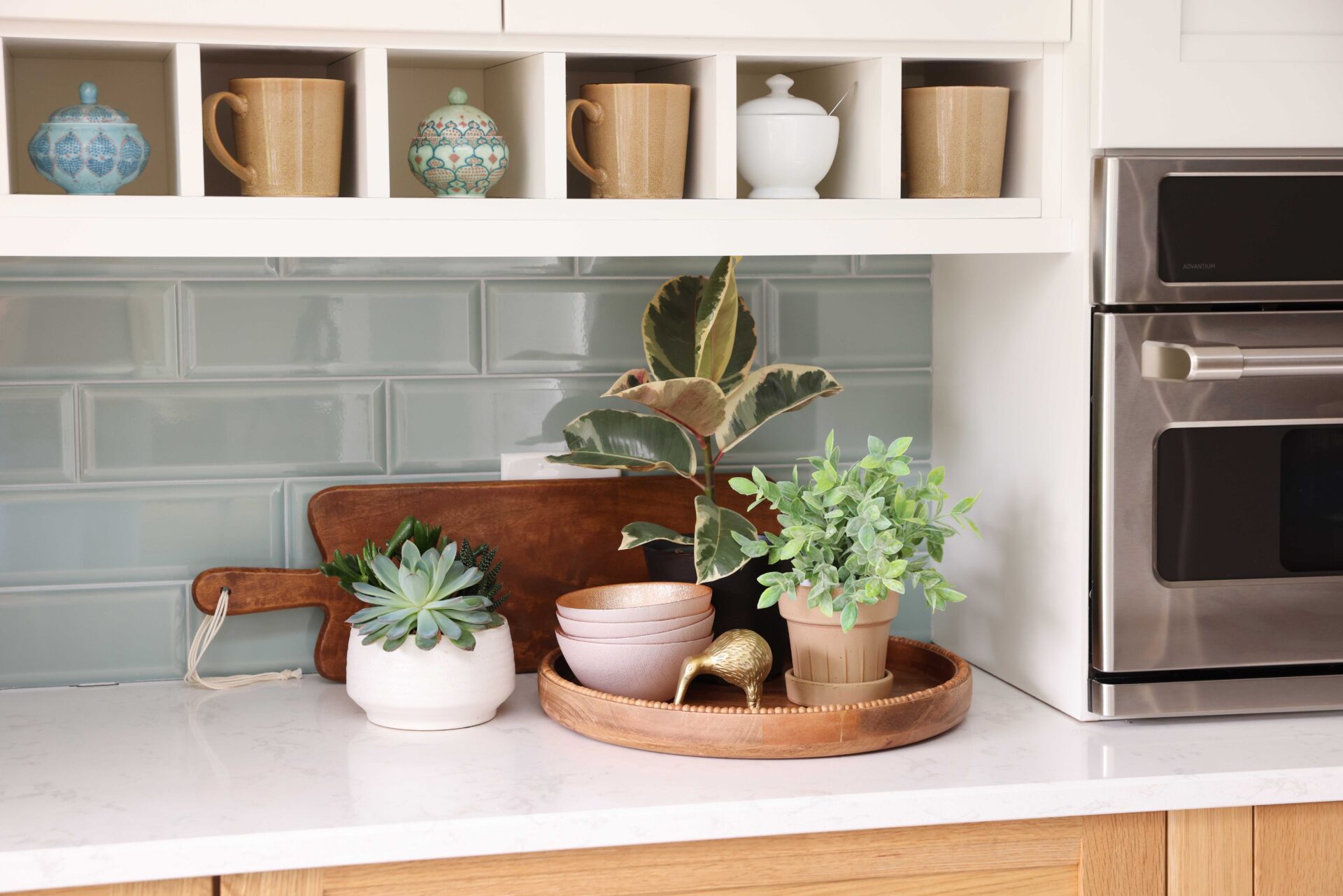 The refreshing design brings in uplifting tones with its light green subway tile, warm wood tones and stacked cabinet accent lighting. The focal point of this unique kitchen is the rift cut white oak range hood and colorful glass mosaic backsplash, which highlights the kitchen’s new connection to the outdoors.