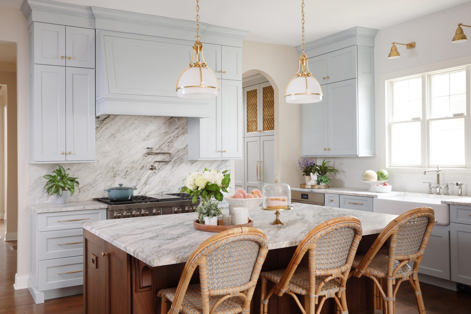 This “new traditional” kitchen balances day-to-day function with classic charm. Gold mesh accents, natural stone, a warm walnut island and soft blue-gray cabinetry bring character to a more user-friendly layout. It’s an updated take on traditional kitchen styling, tailor made for their growing family.