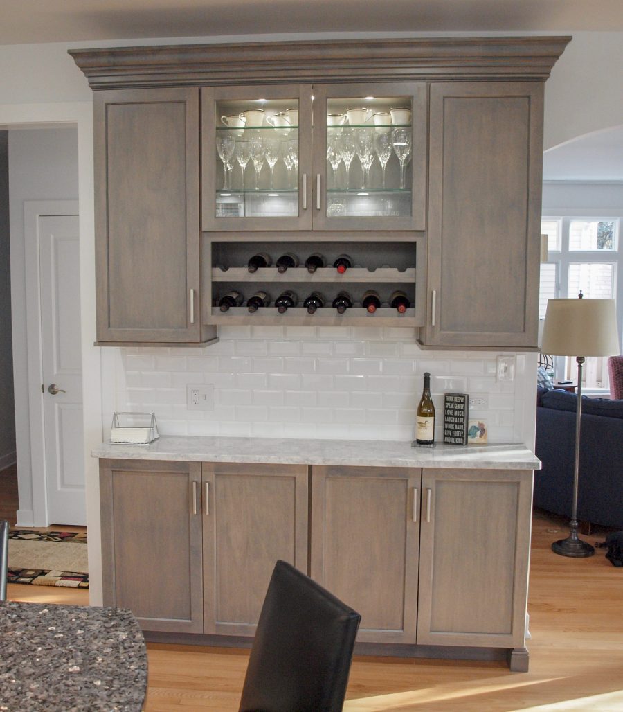 The blue pearl countertop also makes an appearance at the wine center, where glass cabinets shower light on both the pretty crystal glasses above and glistening stone with hints of iridescence below.