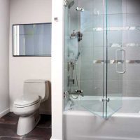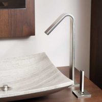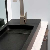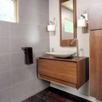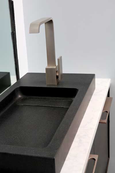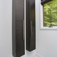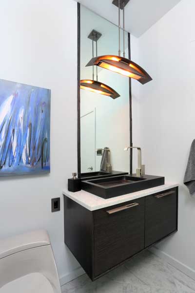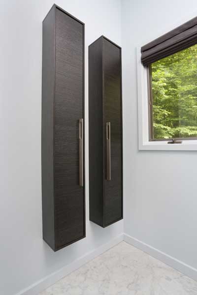 The powder room also has a floating vanity, but its rectangular vessel sink reinforces the straight lines within this room, which are also found in the twin storage cabinets.