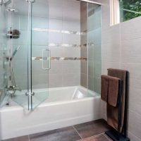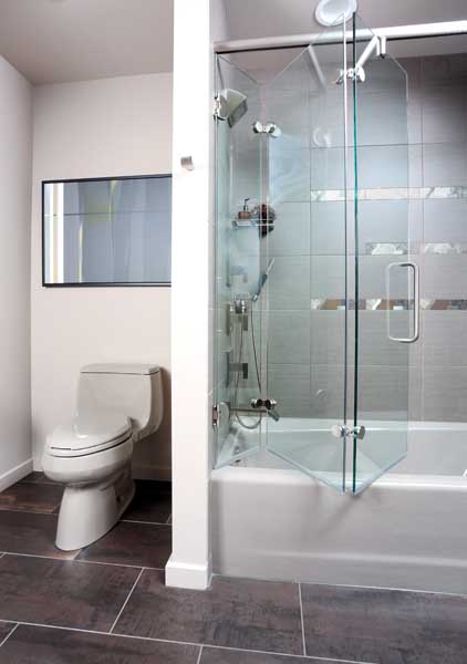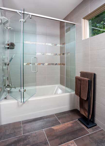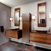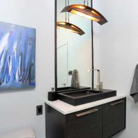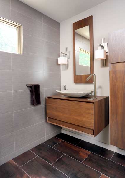 CLOSE MENU This second floor hall bathroom and first floor powder room are both rooted in designs with clean lines and a modern aesthetic. The full bathroom features floating his and hers vanities along with a floating storage cabinet between them. Stone vessel sinks and a tile accent wall add texture and interest to the room.