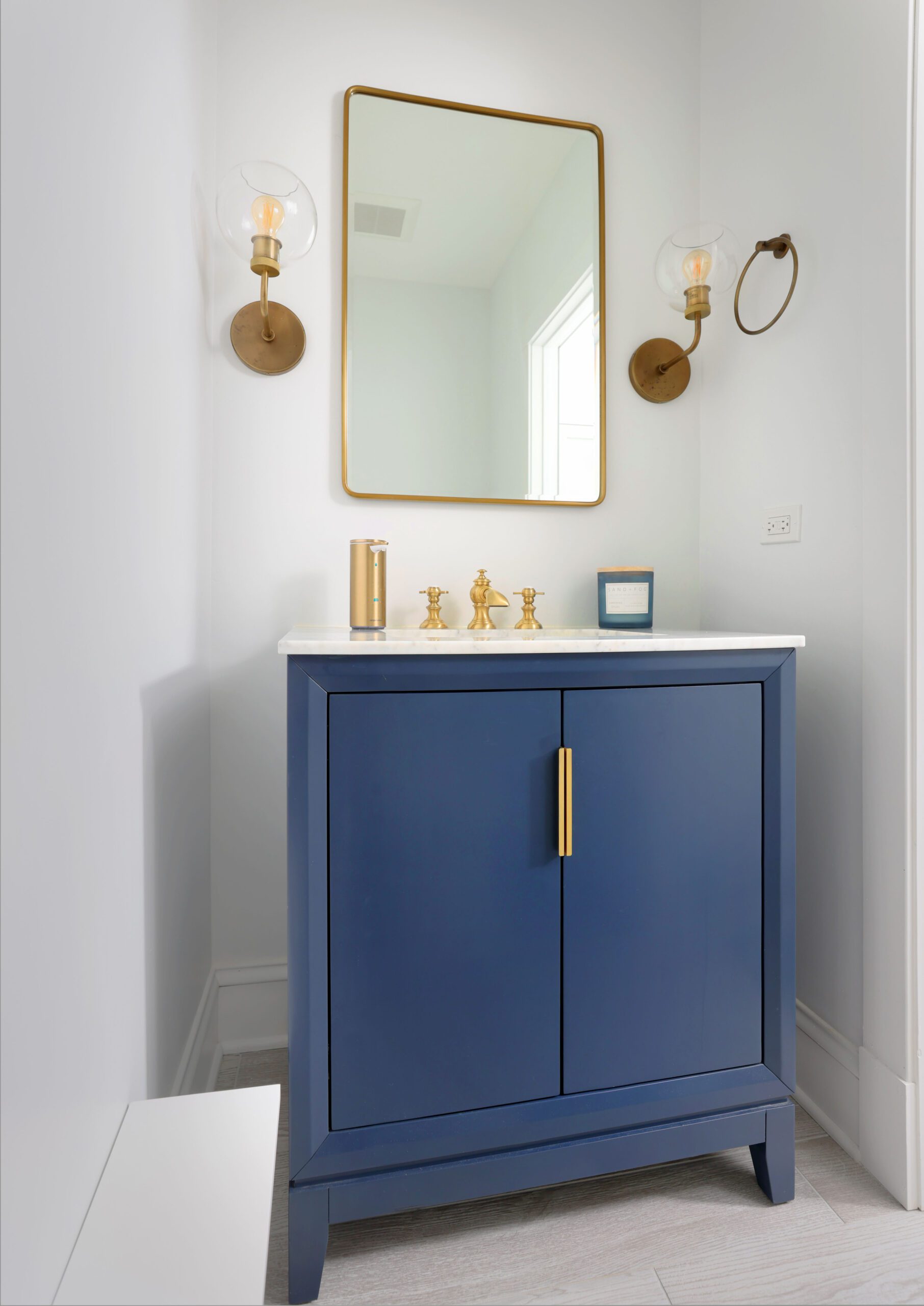 When a full bath is downsized to a powder room off the kitchen, there’s space for a walk-thru pantry that doubles as a mudroom. Compact spaces take advantage of every inch and with cubbies for storage, a bench and shelves for mudroom essentials, this stylish hall leads to a quaint powder room that packs a punch with bold blue.