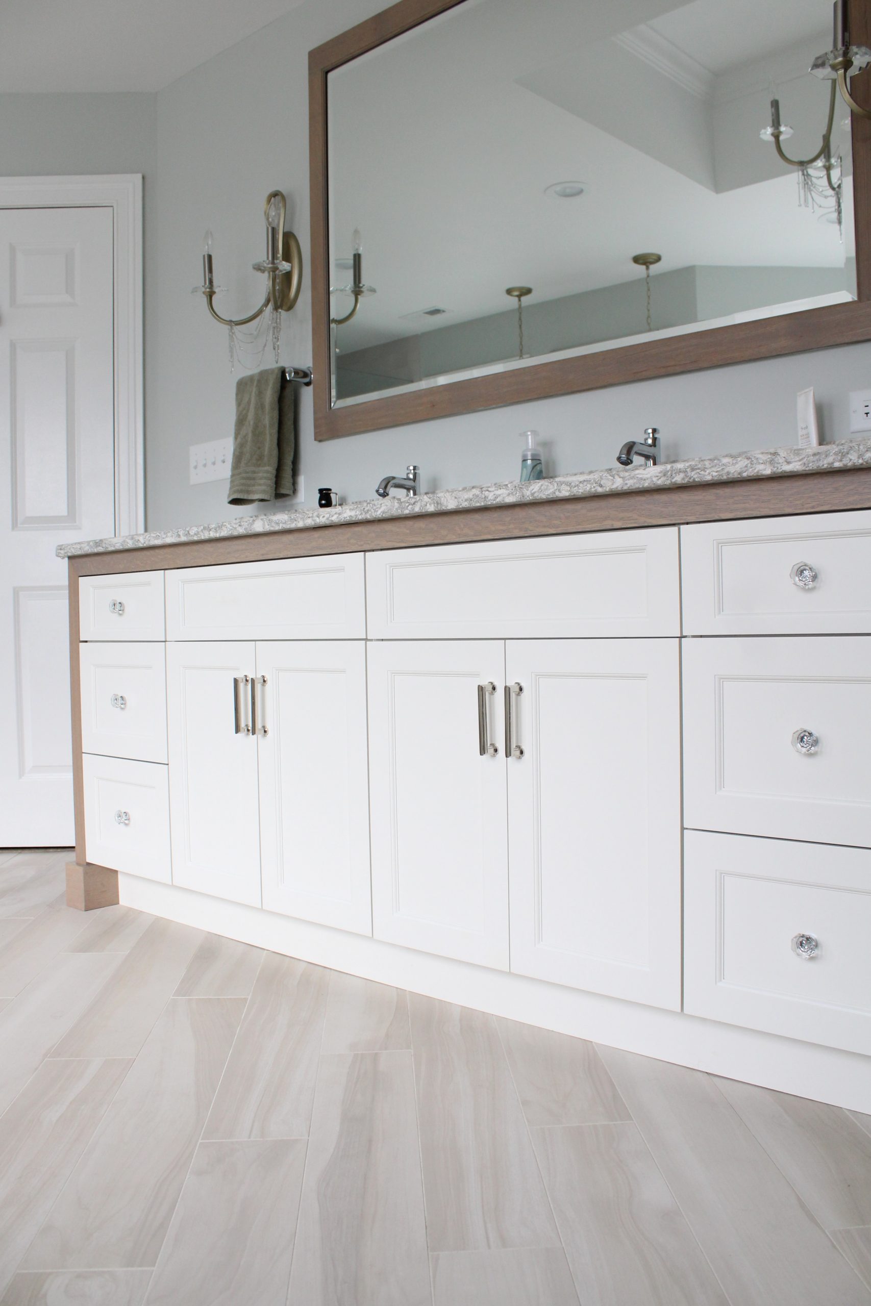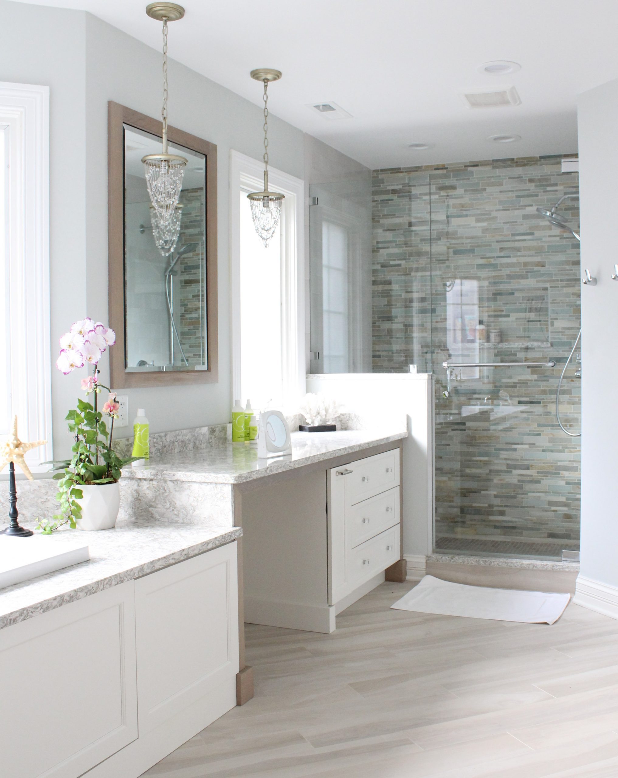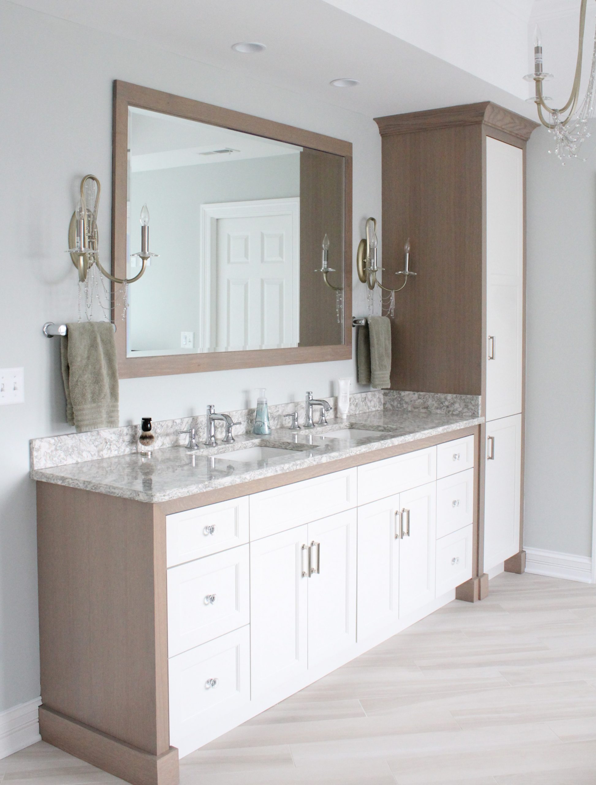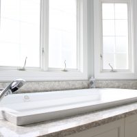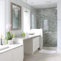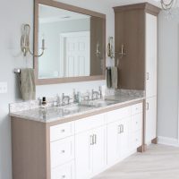 Soothing and serene are the obvious ways to describe this master bathroom. This bathroom’s soothing color palette makes the room a haven, and a place for pampering. The generously sized bathtub, walk-in shower and make-up table all provide an ample excuse to linger in the space. The driftwood white oak that frames the white painted cabinetry further softens the space, bringing in elements of nature and serenity.