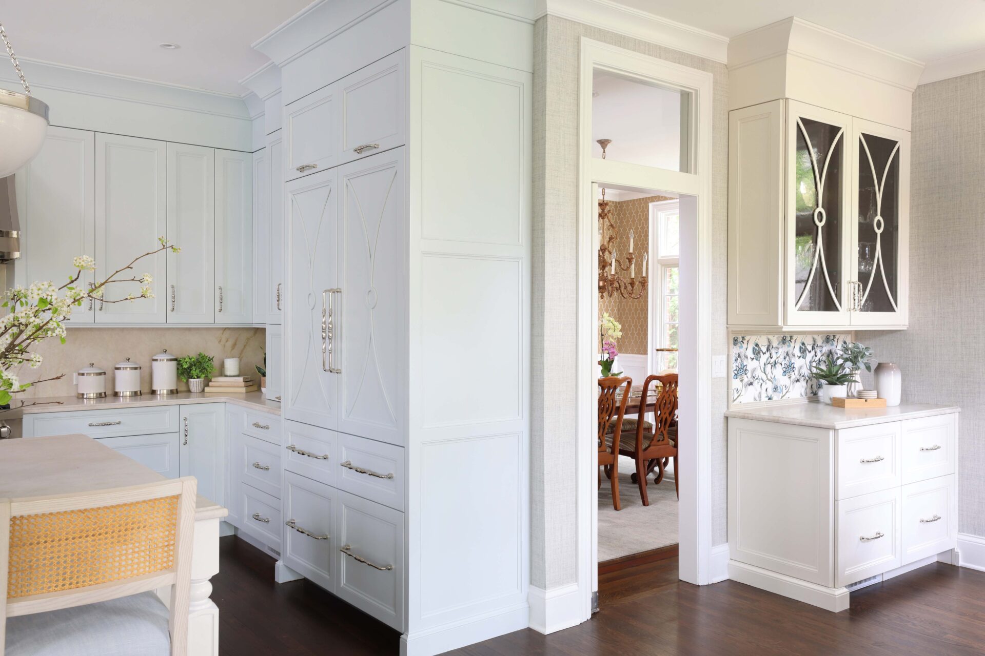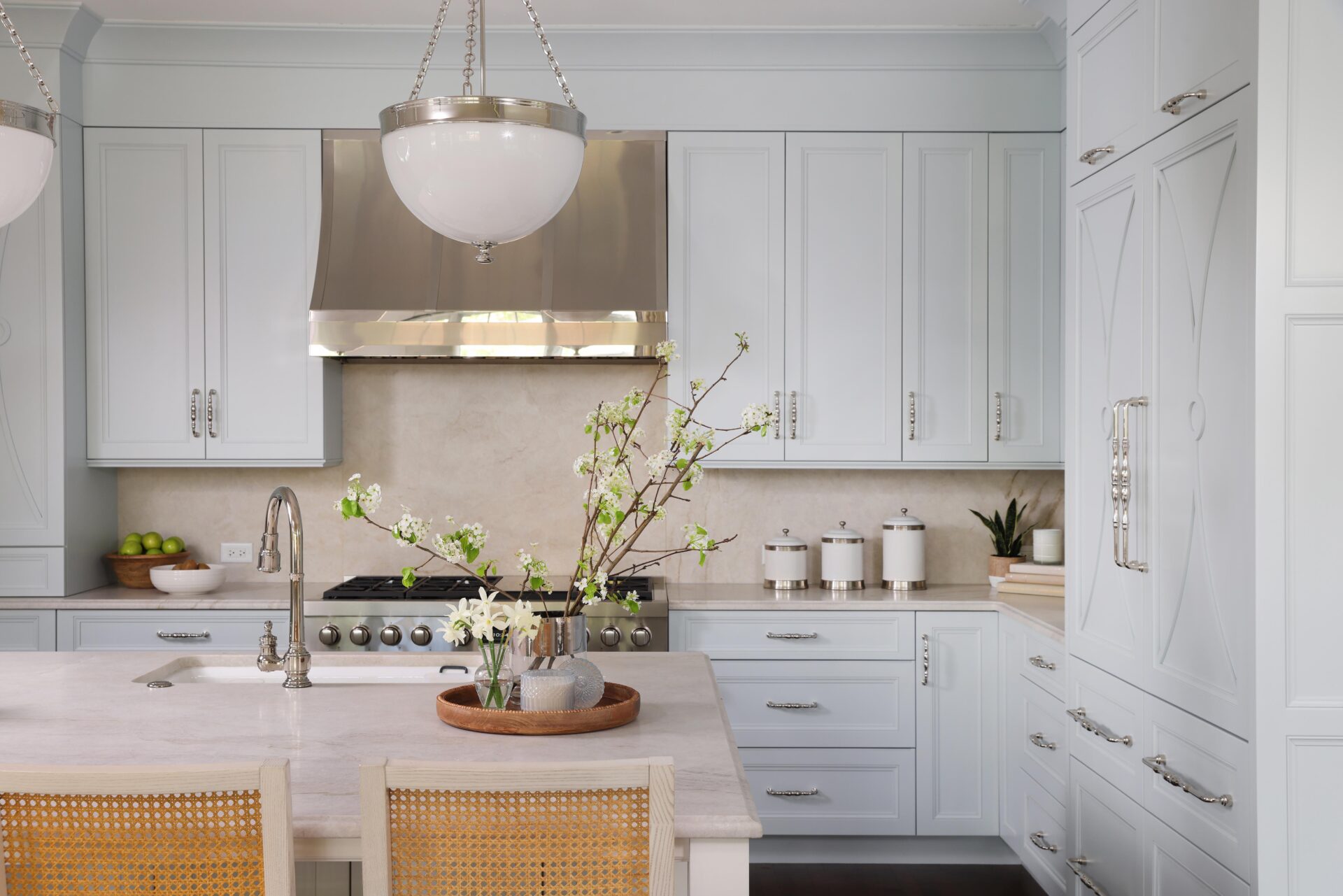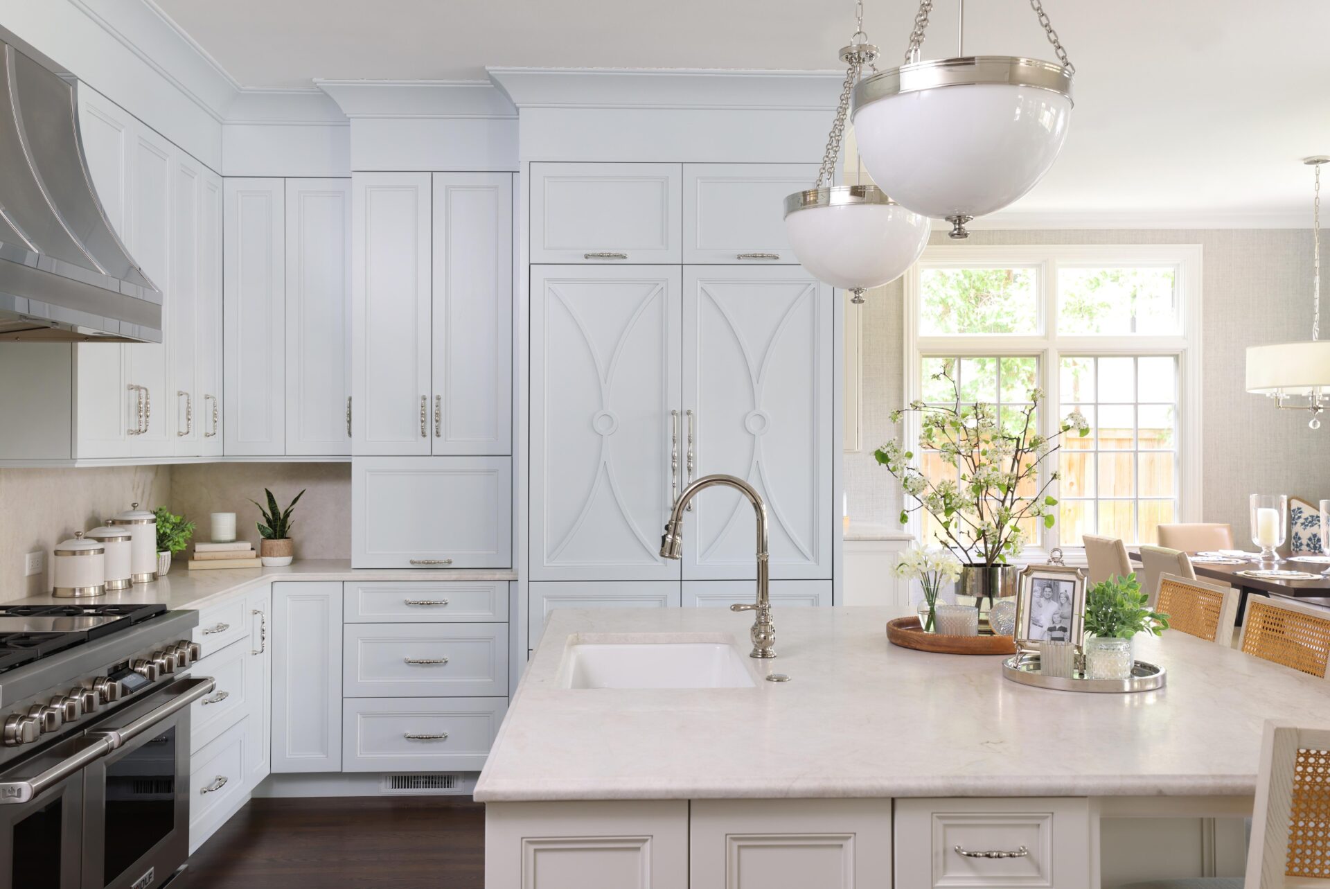 For the overall look, they decided on elegant soft blue cabinetry with a delicate custom grid pattern on select portions, such as the paneled refrigerator, and accented with ornate polished nickel hardware.