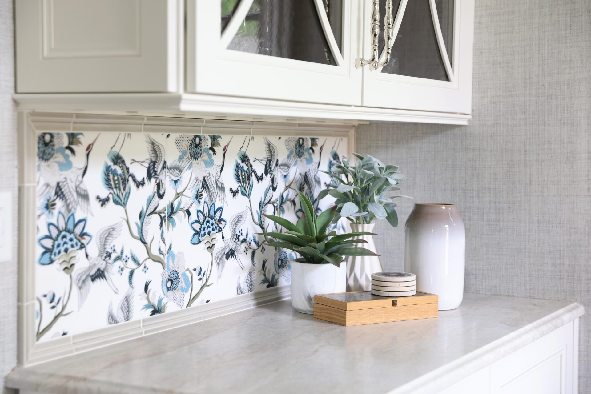 “We were also able to create a small bar space within the breakfast area footprint by shifting the table and creating a custom banquette,” Vince says. To round out their remodel, Elizabeth and Jimmy chose a unique backsplash for the new bar area.
