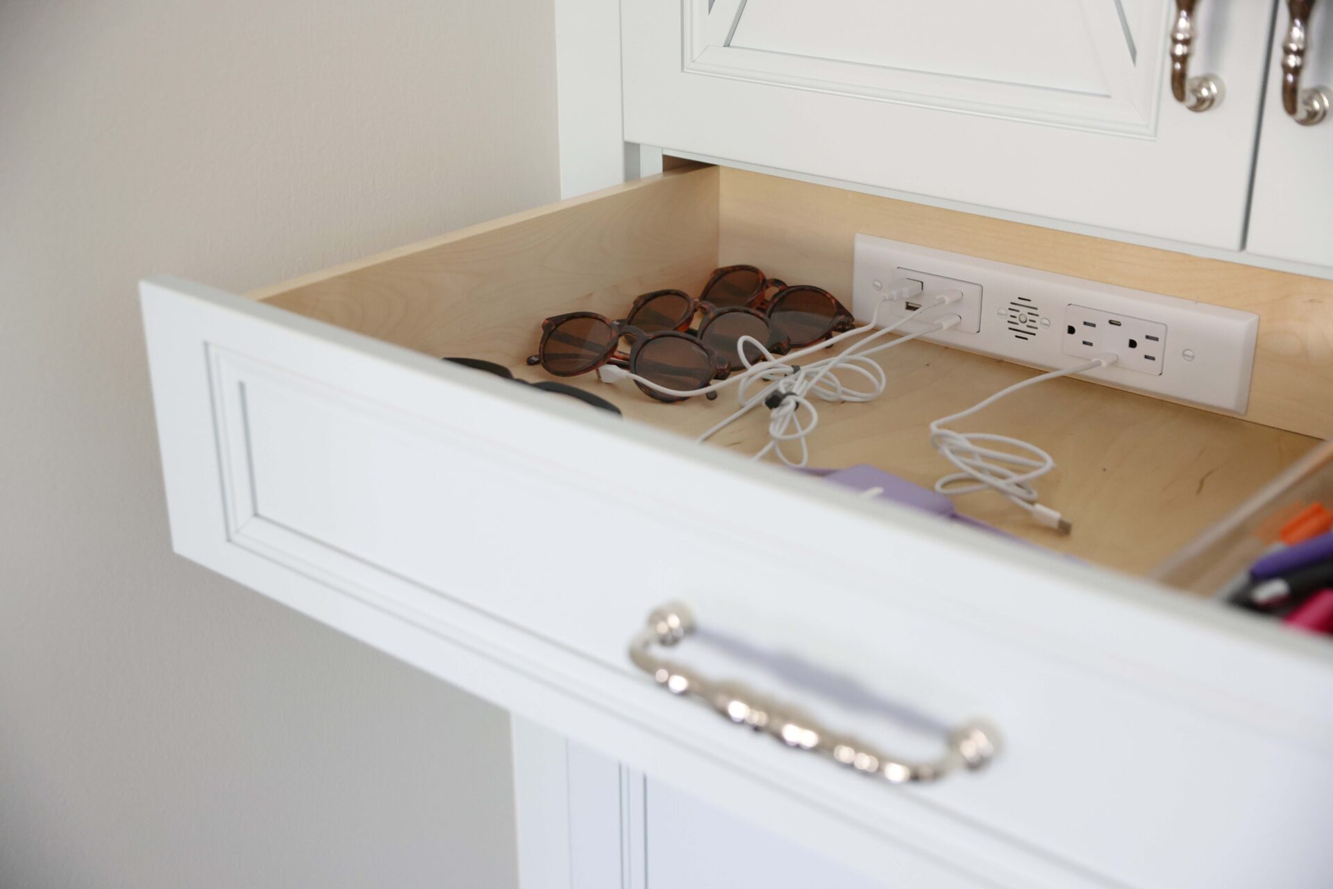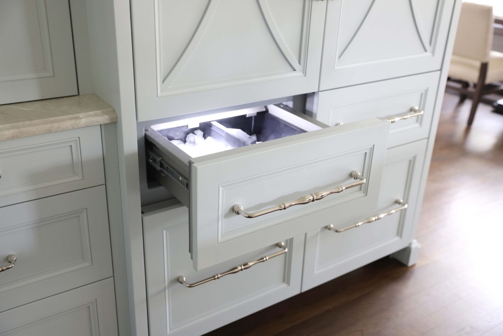 Their new kitchen also has custom storage, like a charging drawer for electronics, and freezer and refrigerator drawers. One drawer is a dedicated ice drawer that makes two different shapes, including a hexagon; another drawer can be set for use as a refrigerator or freezer, depending on the need.