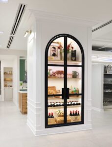But even within the modern styling of the case, traditional nods can be found in the arch top shape and the mullion pattern on the doors. The display case itself is inset into the wall, which is adorned with applied molding, elaborate crown, and architectural details that are undeniably traditional in style.