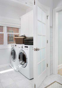 If there is room, many laundry rooms are used as a multi-purpose space on the second floor with first-class features such as custom cabinetry for linen storage or cleaning supplies. If space is an issue, a small closet can be transformed into a laundry hub with stackable machines.