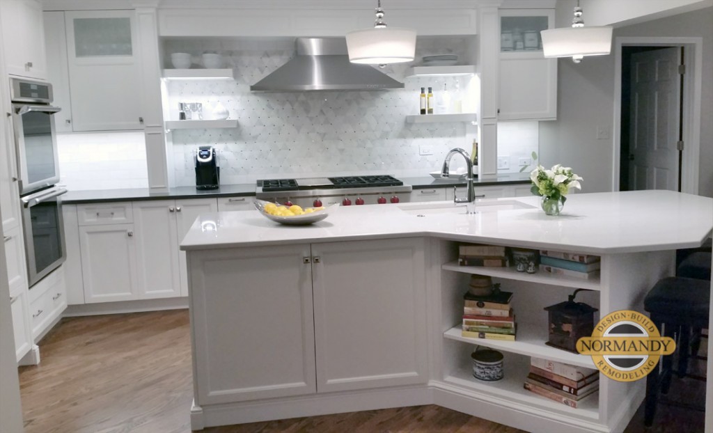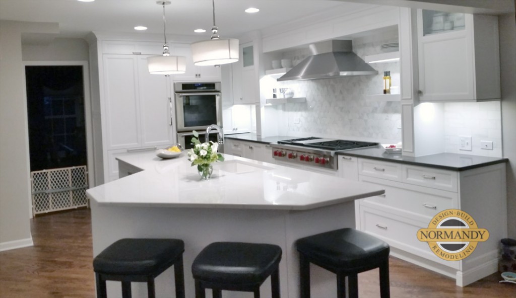 Individuality: Cookie-cutter kitchens are definitely on the outs, and personal selections that are interesting to you have taken their place. “In this kitchen, the focus on geometry shines through,” commented Leslie. “You can find it in the angular island shape, the triangular shape of the backsplash tile, the emphasis on the square angles for the floating shelves, and even down to the round mirrored tile insets for the backsplash tile.” The details are what elevate this kitchen from ‘just another white kitchen’ into something that has personality and fits this family to a T.