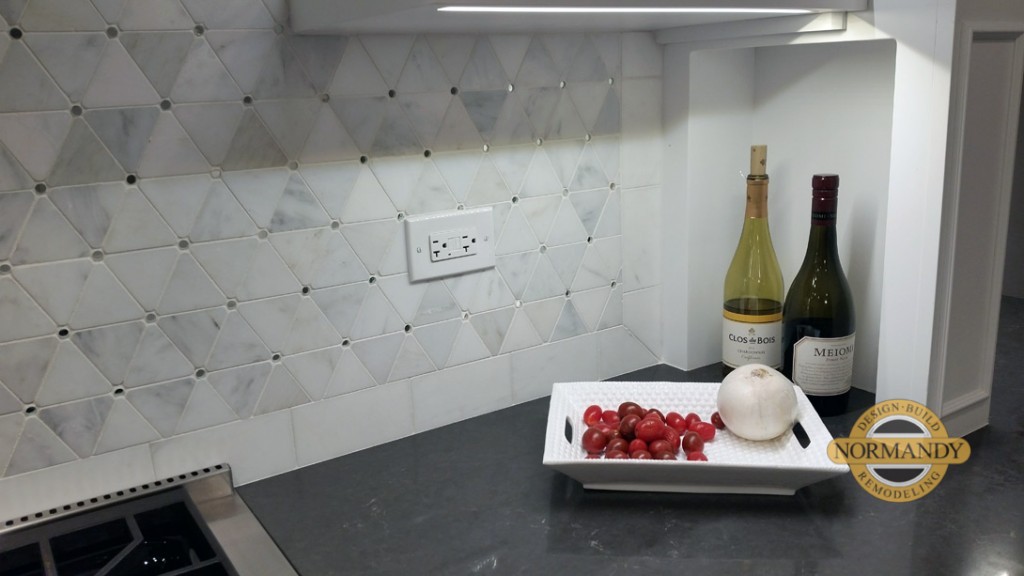 Marble backsplash: “Natural stone is always a wish-list item in the kitchen, but marble, in particular can take a beating under the harsh conditions of everyday use in the kitchen,” noted Leslie. Using a triangle-shaped marble tile for the backsplash puts the beauty of Carrara marble on display while decreasing the risk of staining and damage from normal kitchen functions by installing it on a vertical surface. “You still have the potential for the marble tile to stain, even in the backsplash,” shared Leslie, “so be mindful of marble’s vulnerability before putting it anywhere in your kitchen.”