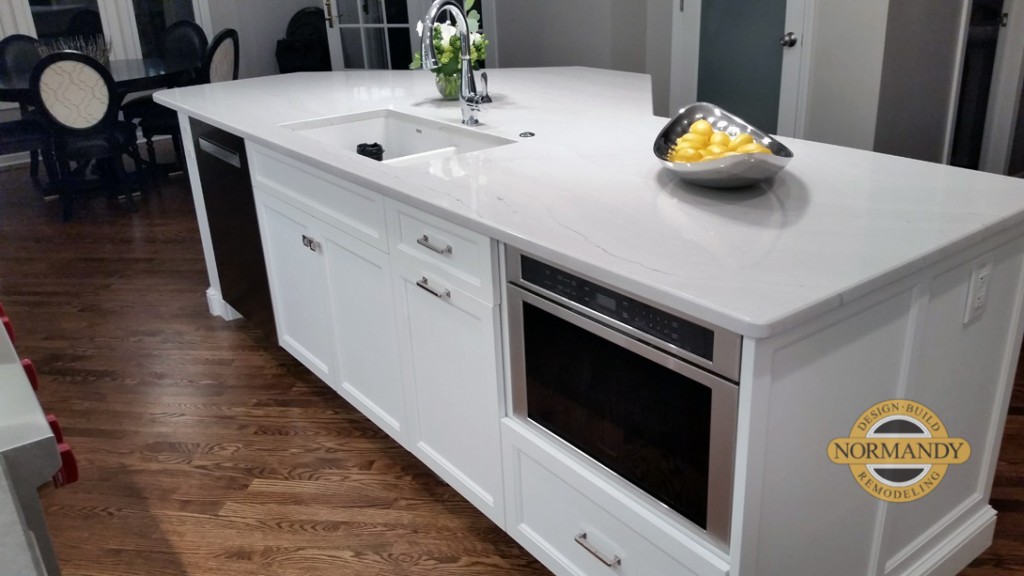 Maintenance free countertops: Marble found a place in the backsplash for this kitchen, but a more durable choice for the countertops was in order. “Two different quartz countertop colors were selected, but their muted pattern doesn’t compete with the other elements of the kitchen’s design,” says Leslie. “Because these are man-made countertops, they require virtually no maintenance and can easily withstand the family’s daily use without showing wear.”