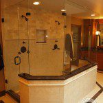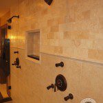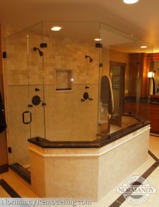 It features a luxurious shower with two sets of shower heads and body sprays, bench and shampoo niche. This master bath needed to be a retreat from the outside world enabling the homeowners to relax or get ready in the morning without bumping into each other. The bathroom also has matching vanities with plenty of storage, one on either side of the shower to continue with the “his and her” theme.