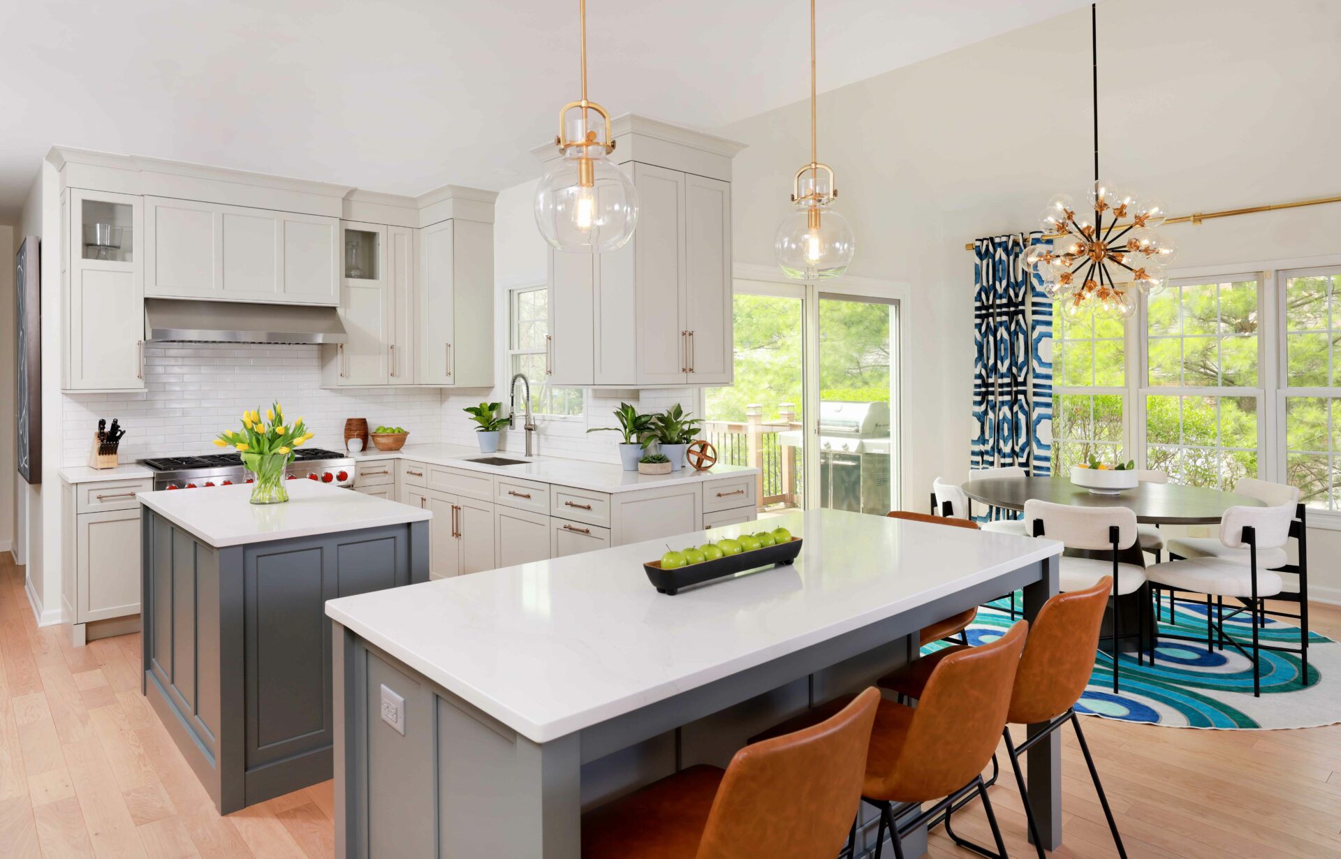 This warmed-up white kitchen is today’s version of a classic white kitchen, but with contrast and softness to ensure it will stand the test of time. Two well proportioned islands replaced a singular larger one, giving an improved walk pattern and better usability of each. With one island dedicated to prep and another for dining or serving, this kitchen is ready for weeknight family dinners or gatherings on the weekend.