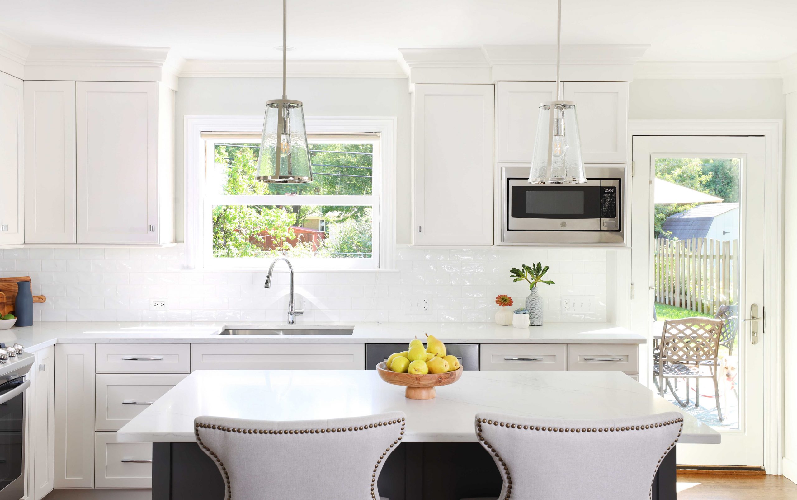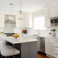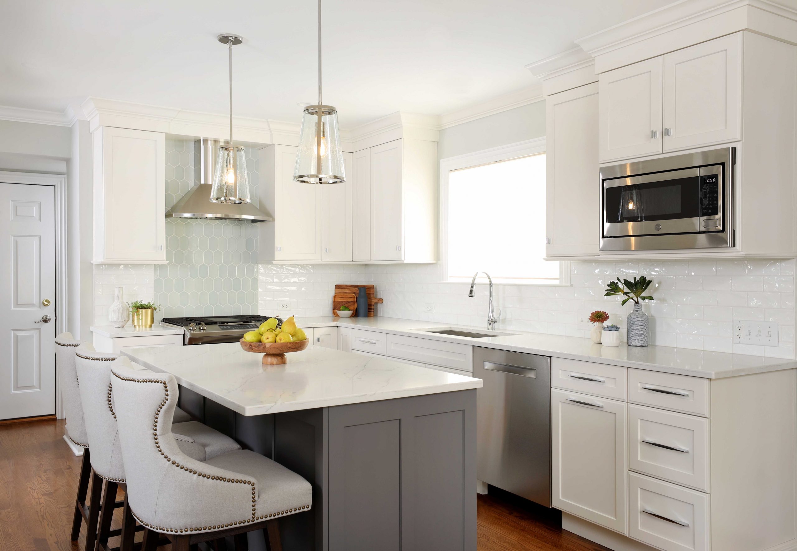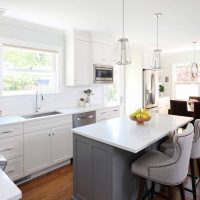 With space for dining at the island or nearby kitchen table, this charming white kitchen with gray and soft blue accents is all about gathering. This kitchen is modest in size, but it takes full advantage of the entire space and creates an warm and inviting atmosphere that brings the whole family together.