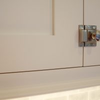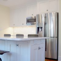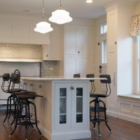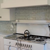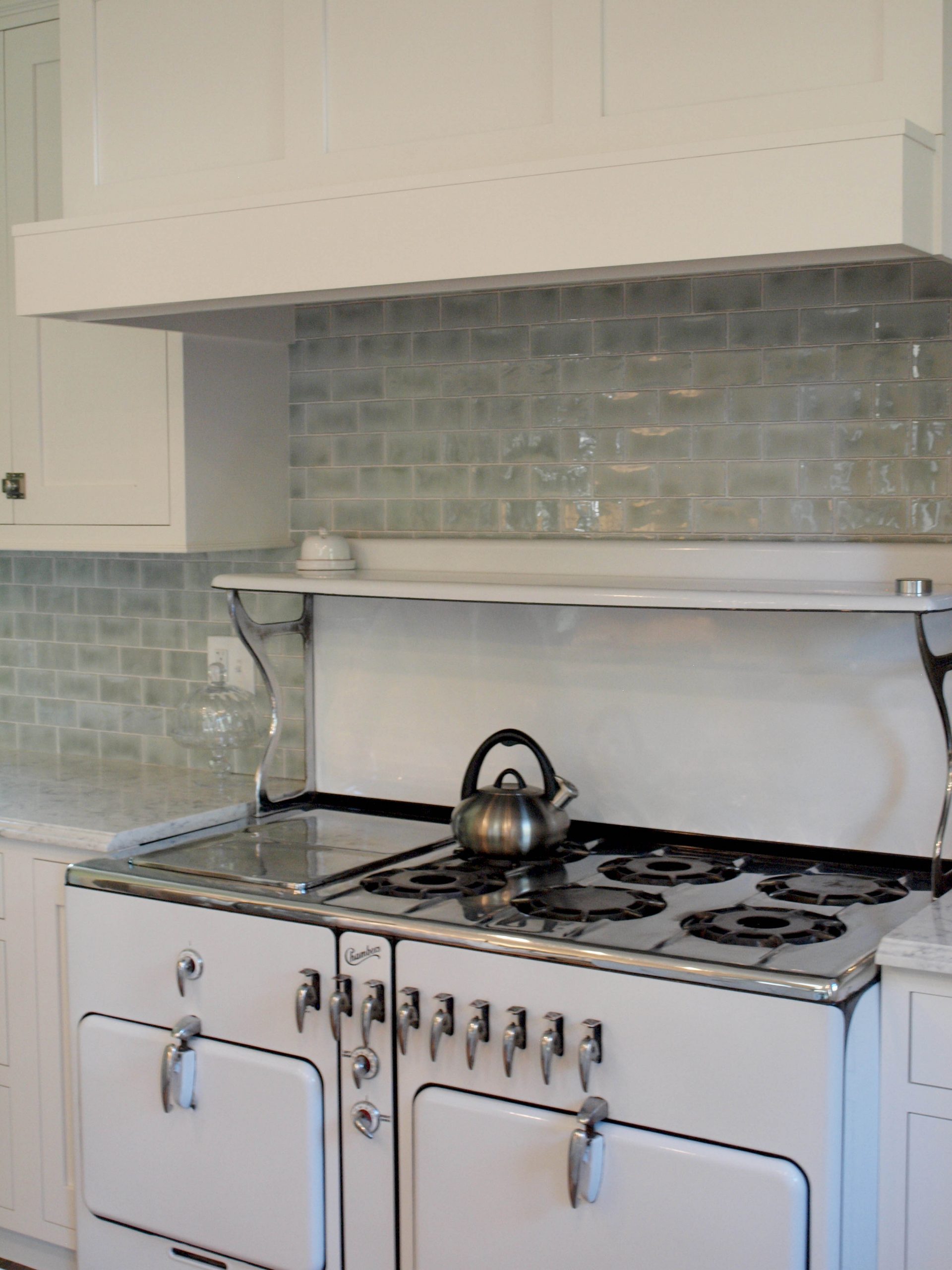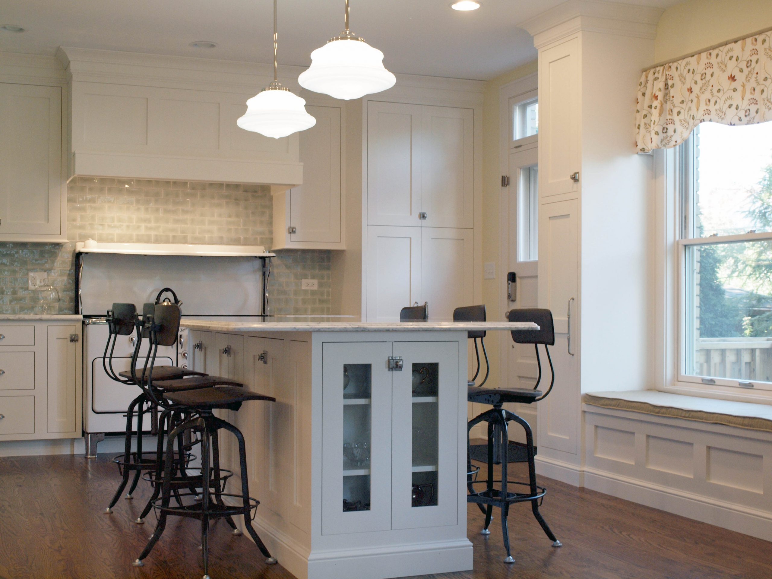 A unique, vintage style stove is the centerpiece of this kitchen, which features vintage-inspired touches throughout. The island features seating on either side, and cabinet latches offer a period detail to the space. Once a grouping of small disjointed spaces, this kitchen is now open to the adjoining dining room and capitalizes on space once underutilized rooms.