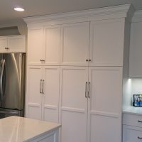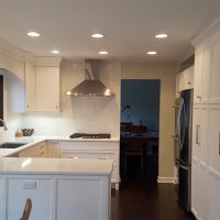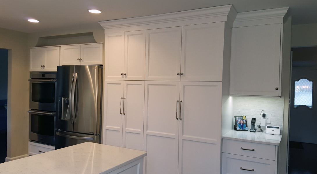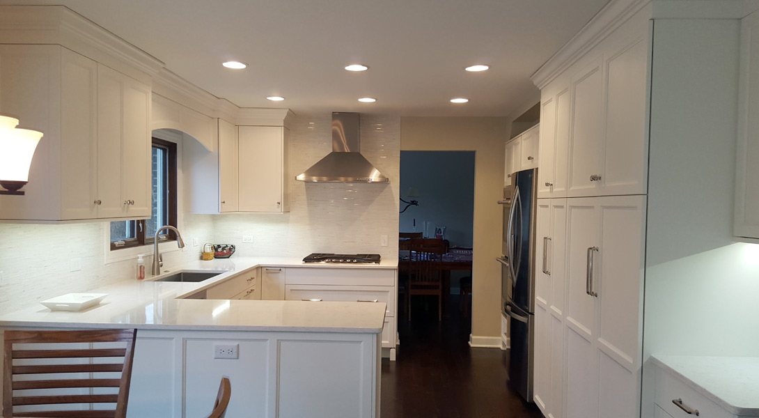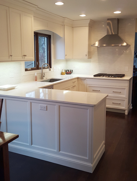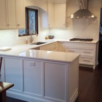 This medium sized U-shaped kitchen has layers of white for a crisp, bright look. The white cabinets, countertop and backsplash tile all work together to create a kitchen that’s anything but vanilla.